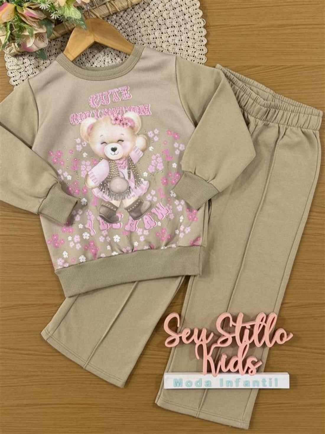 Conjunto Infantil Cinti Inverno com Calça e Moletom Flanelado Bege Ursinha Cute
