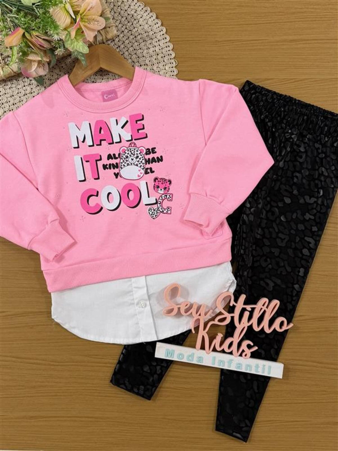 Conjunto Infantil Cinti Inverno com Calça Legging Preta e Moletom Rosa Make It Cool