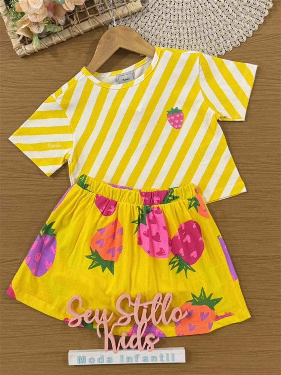 Conjunto Infantil Bimbi Verão com Saia e Blusa Amarela Listrada Moranguinho