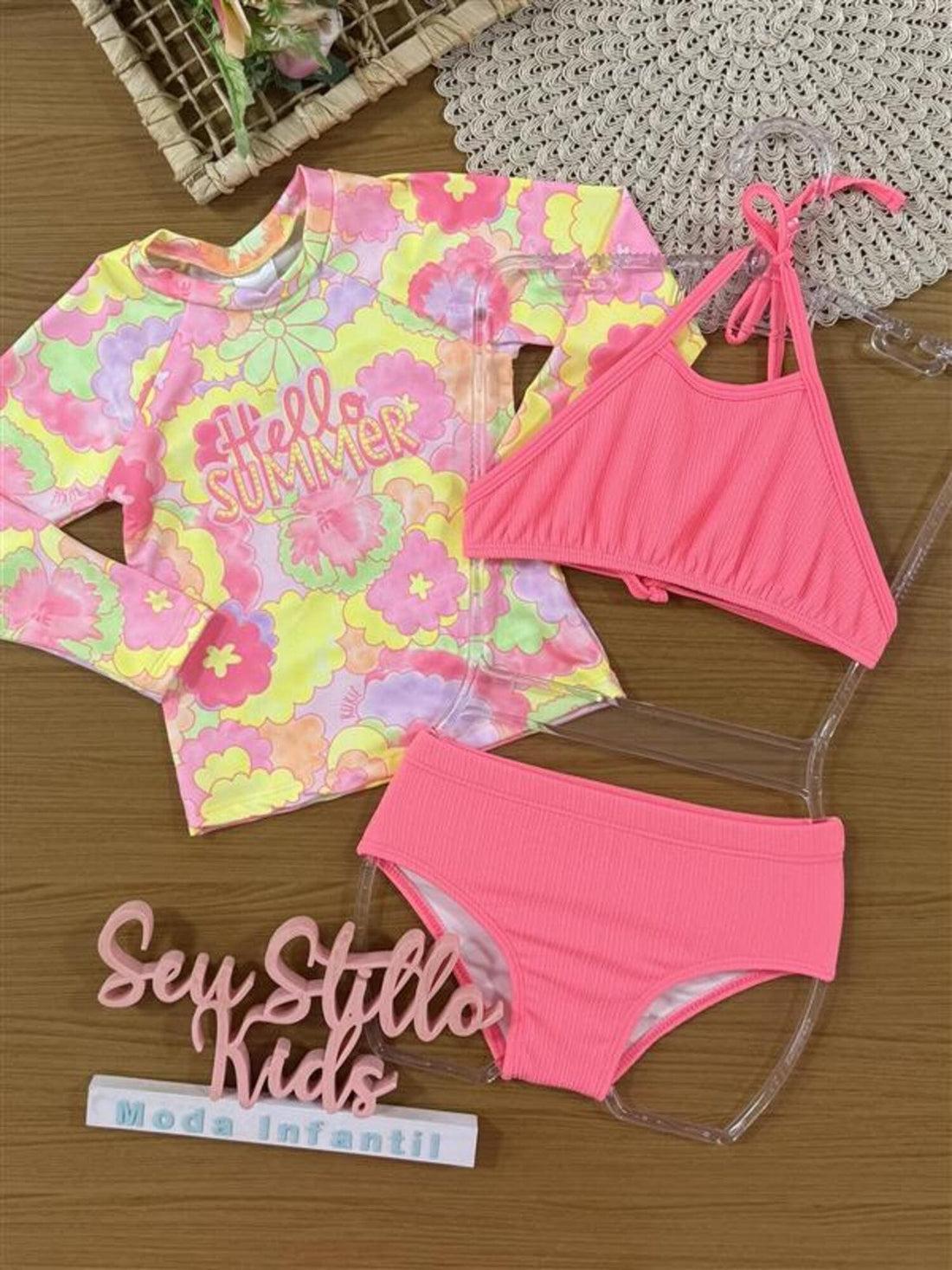 Biquíni Infantil Kukiê Verão Rosa com Blusa Manga Longa Floral