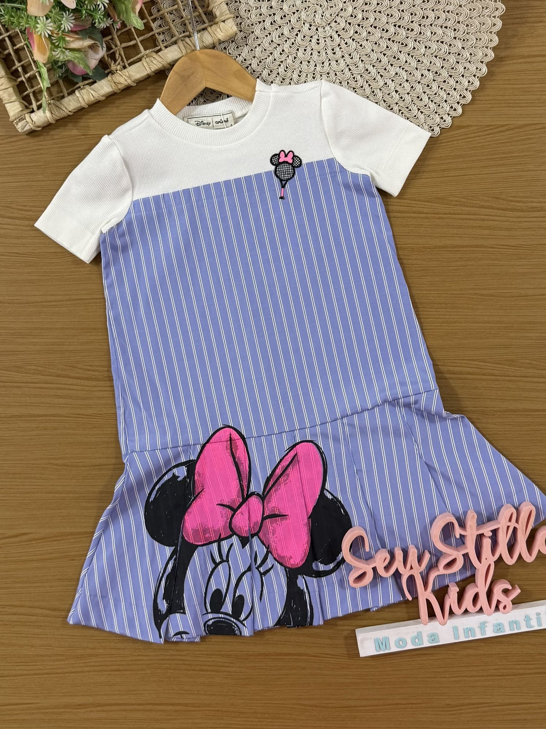 Vestido Infantil Animê Verão Azul Listrado Minnie Tênista Disney