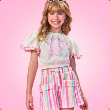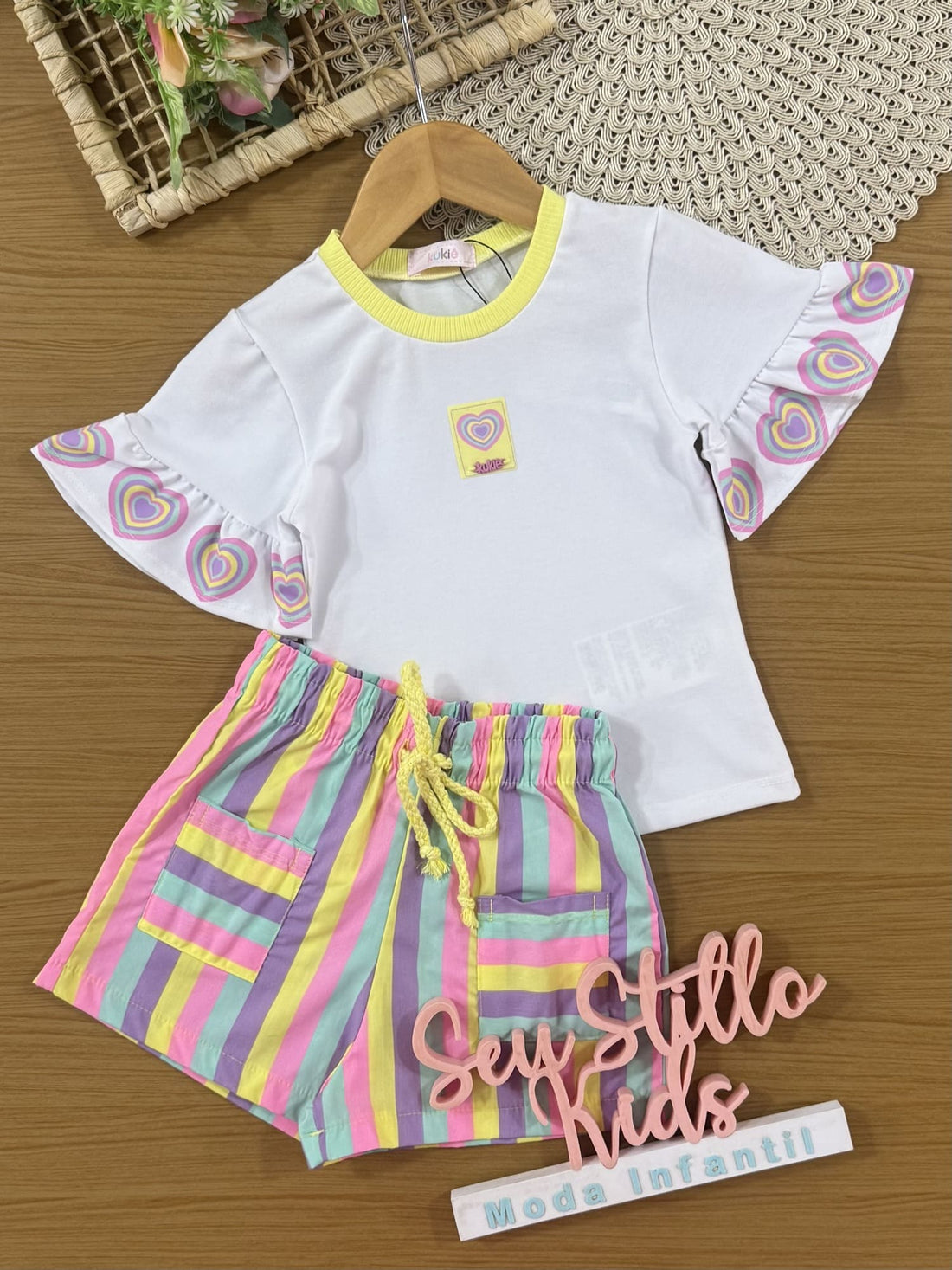 Conjunto Infantil Kukiê Verão com Shorts Colorido e Blusa Branca Corações