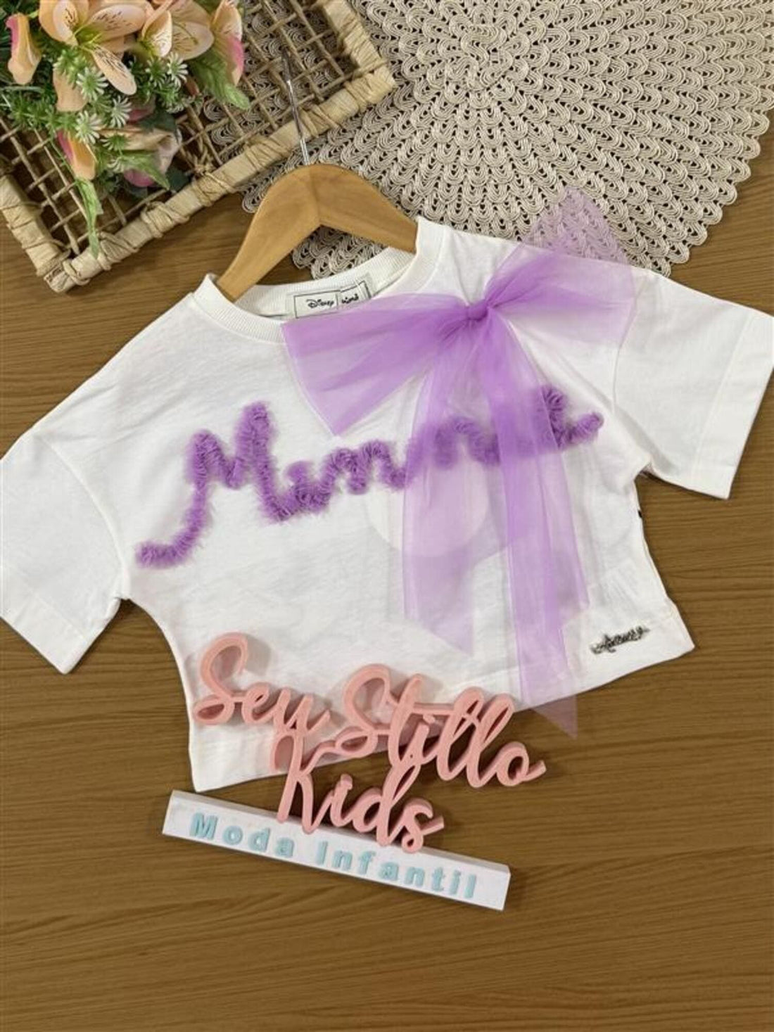 Blusa Infantil Animê Verão Branca Minnie com Lacinho em Tule