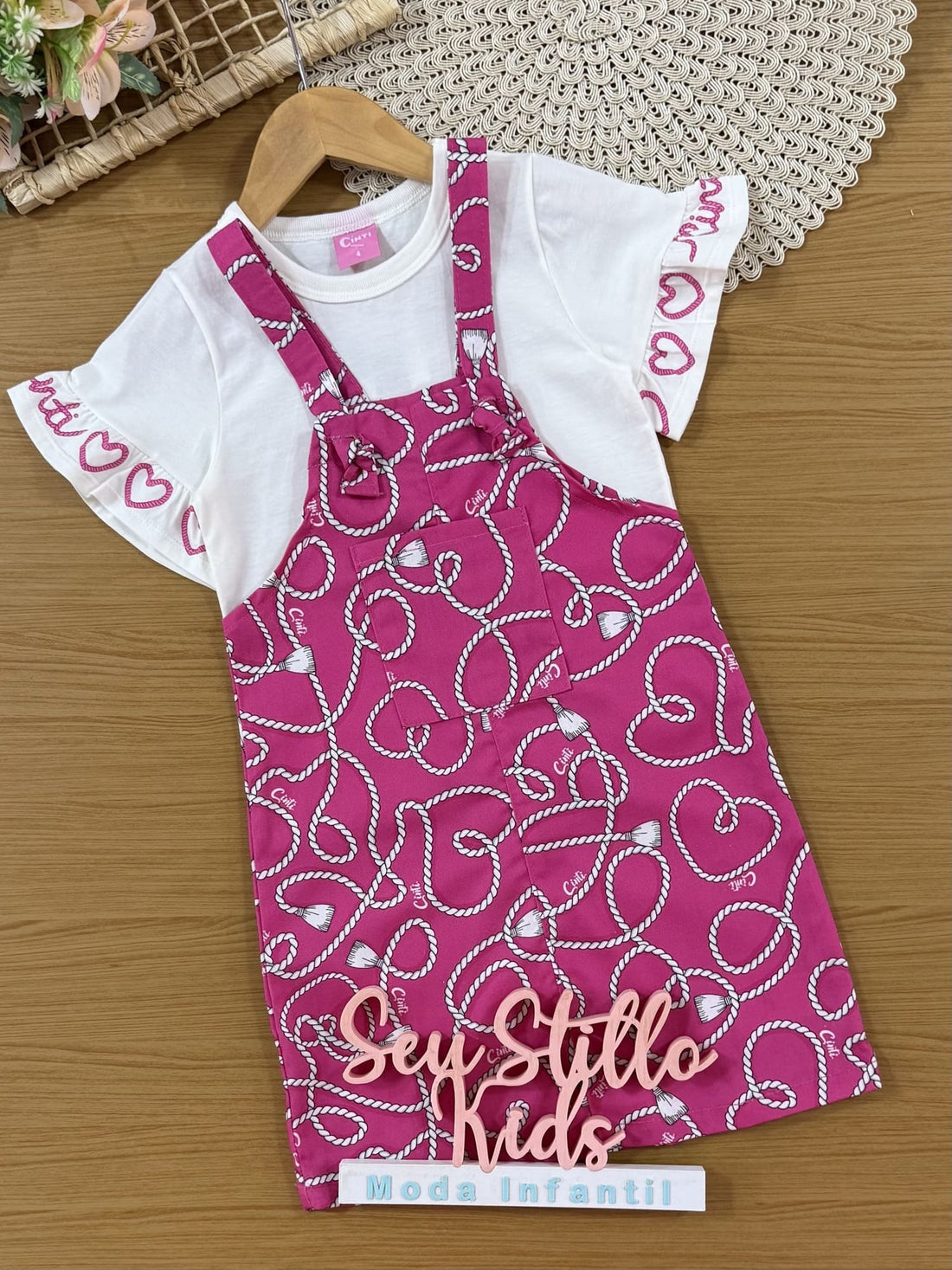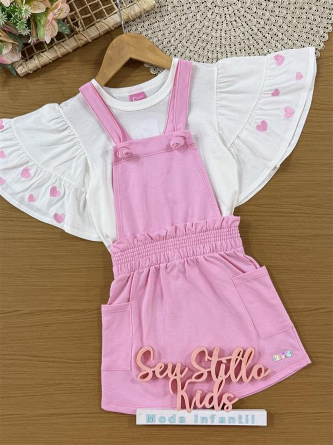 Salopete Infantil Cinti Verão Rosa com Blusa Branca Corações