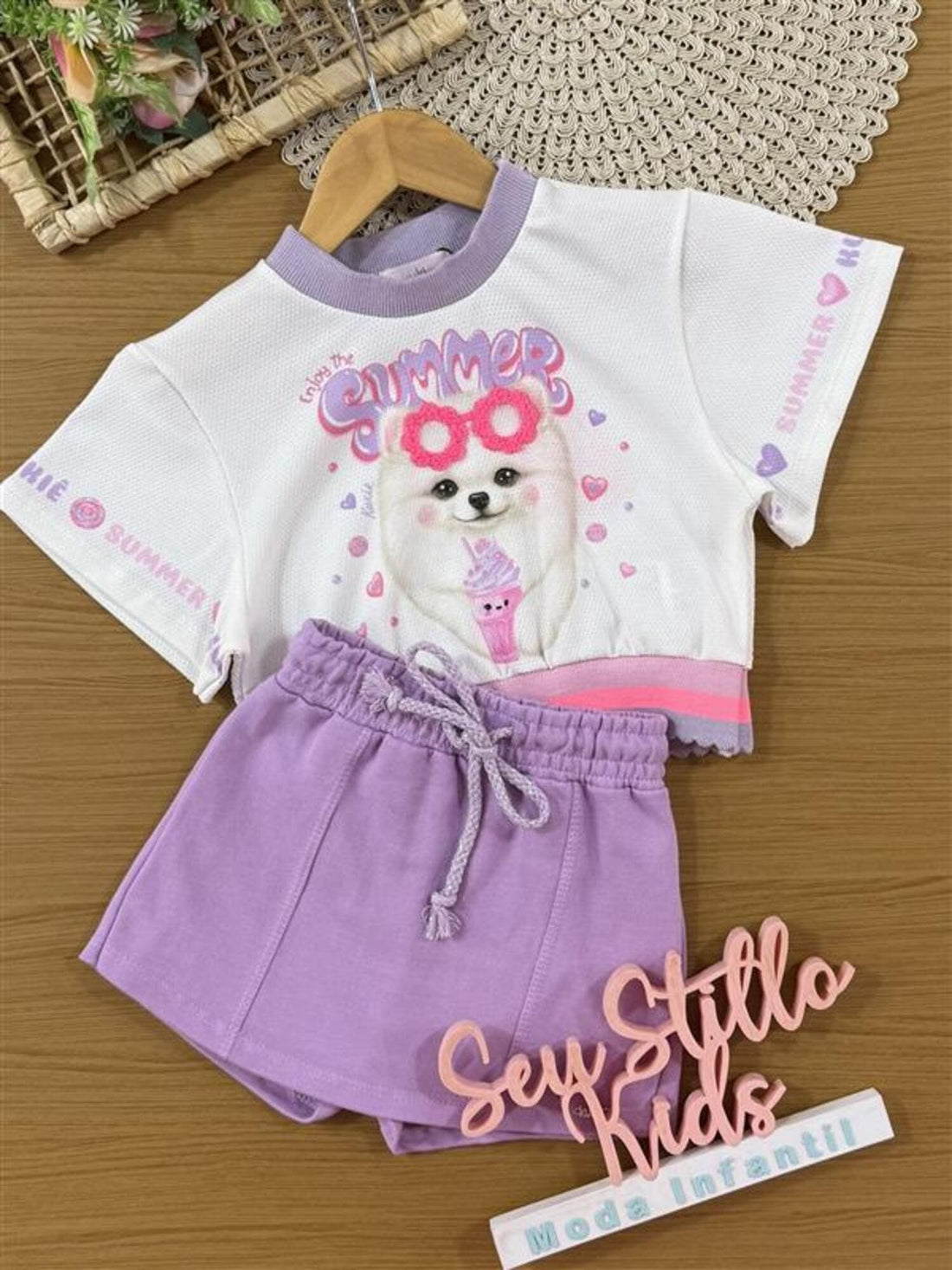 Conjunto Infantil Kukiê Verão com Shorts Saia Lilás e Blusa Branca Cachorrinha Summer