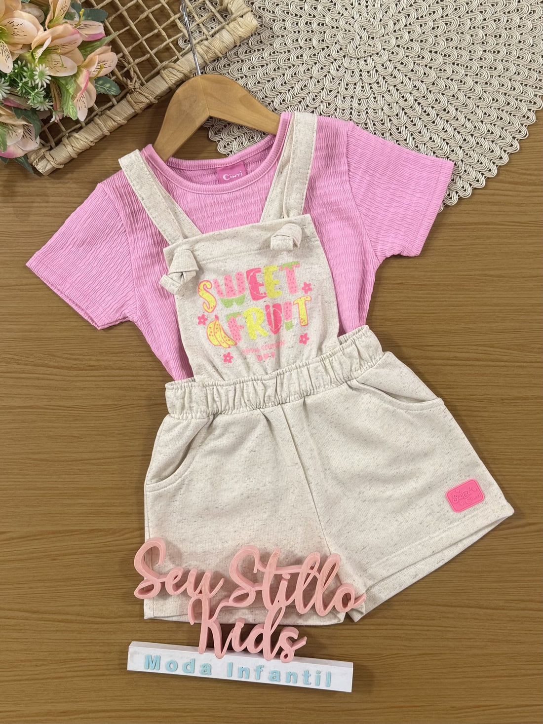 Jardineira Infantil Cinti Verão Off White Frutinhas com Blusa Rosa