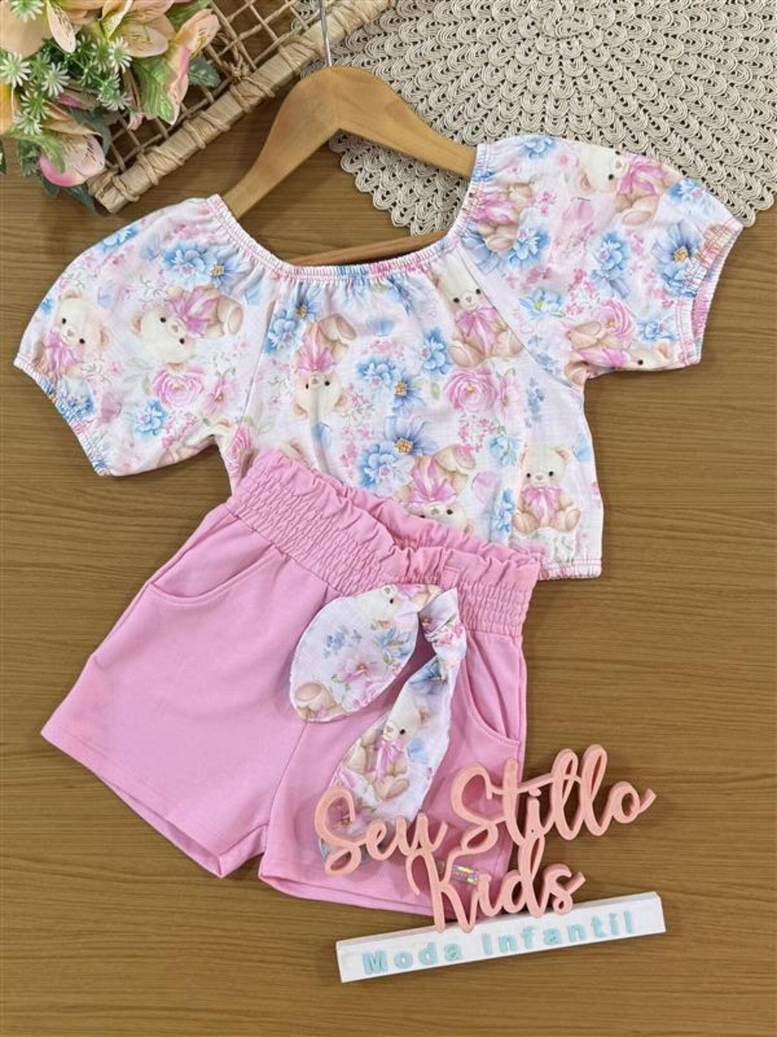 Conjunto Infantil Cinti Verão com Shorts Lacinho e Blusa Rosa Estampada