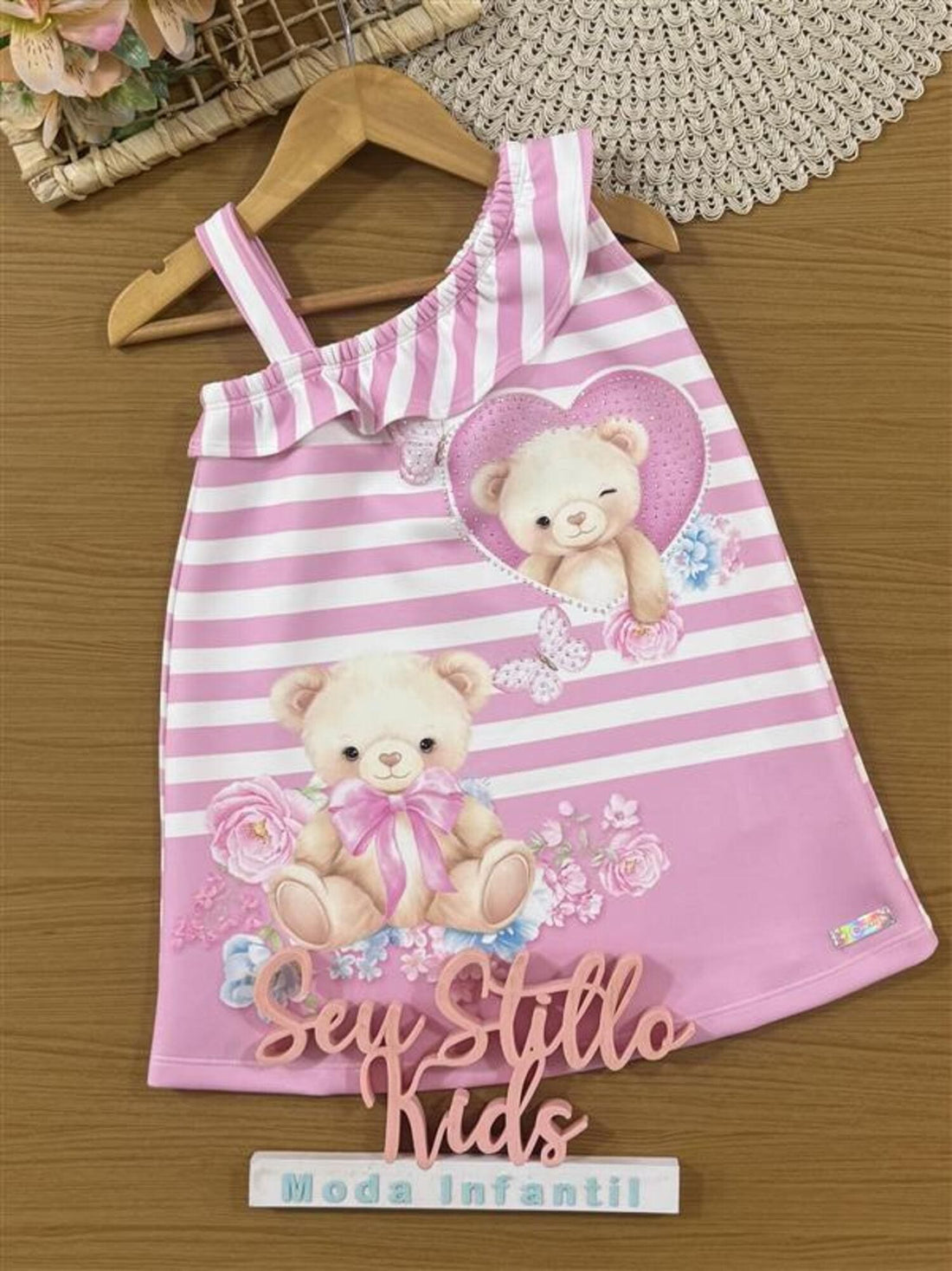 Vestido Infantil Cinti Verão Rosa Listrado Ursinha Coração com Strass