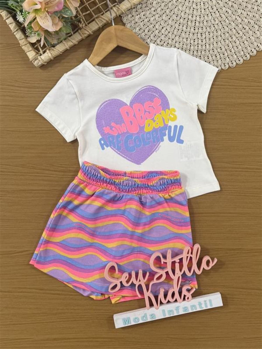 Conjunto Infantil Momi Verão, Shorts Saia Colorido e Blusa Branca Coração com Strass