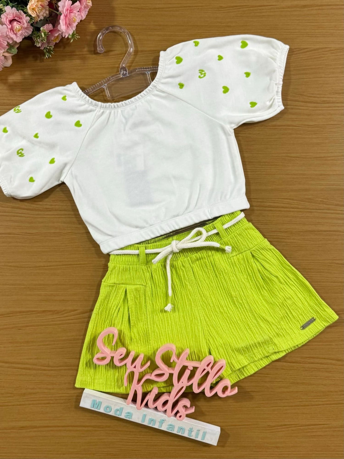Conjunto Infantil Catavento Verão Shorts Verde e Blusa Coração