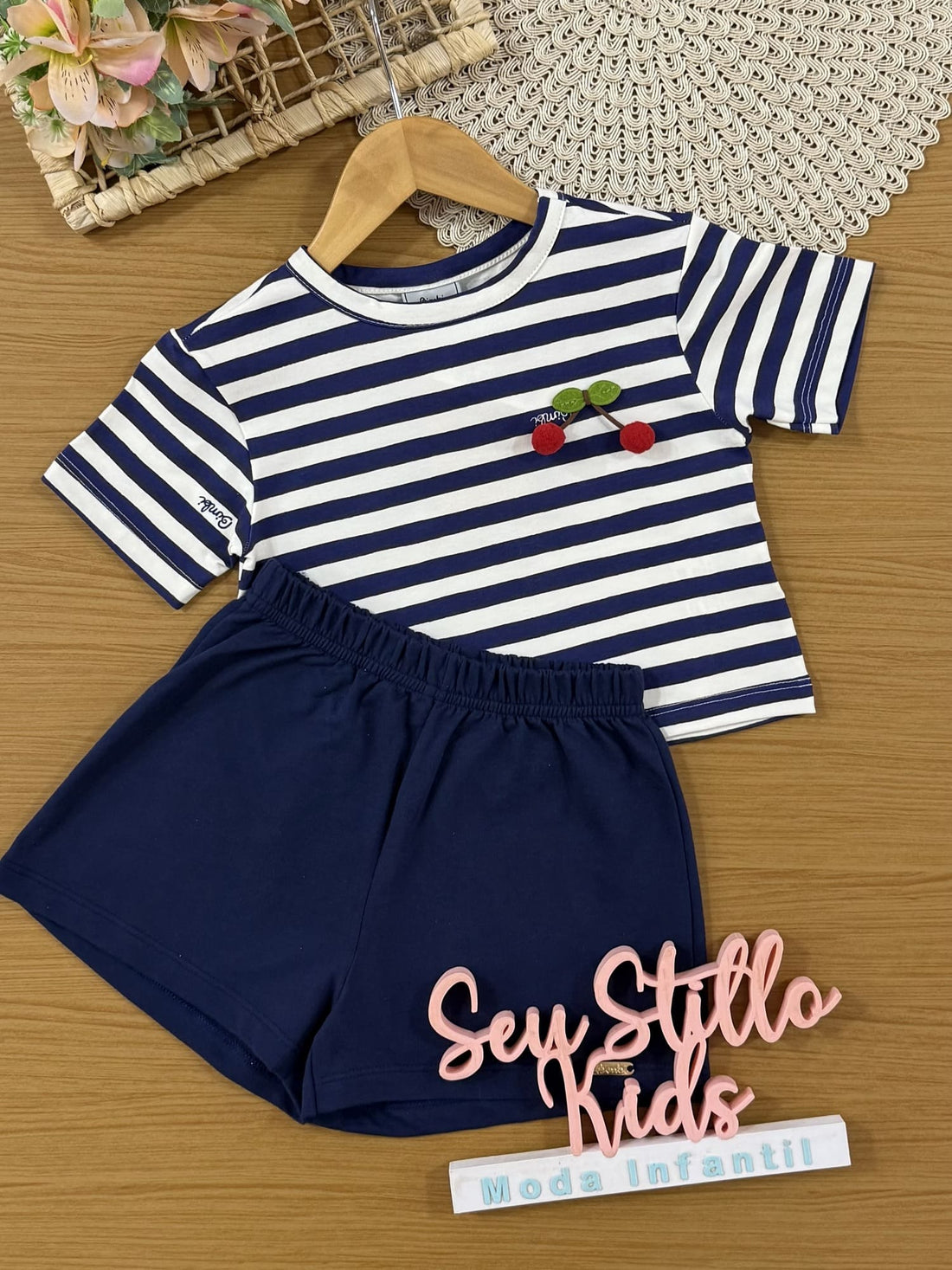 Conjunto Infantil Bimbi Verão com Shorts Azul Marinho e Blusa Listrada Cerejinha