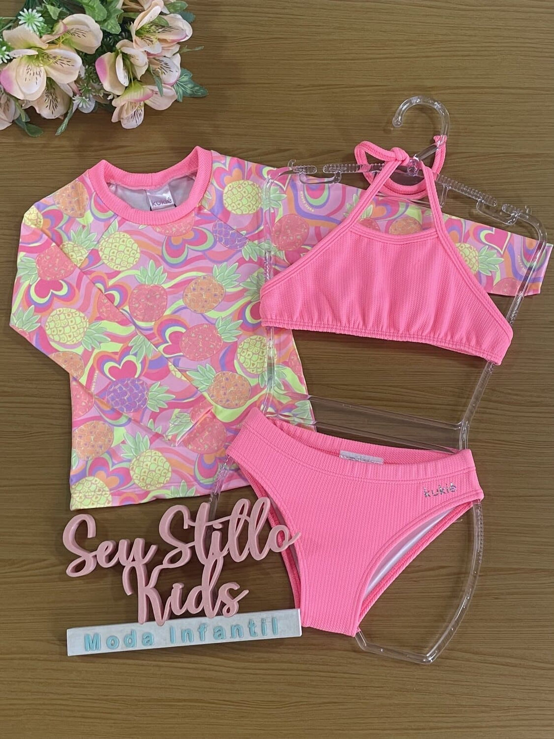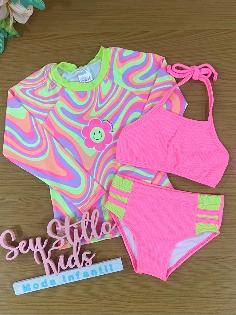 Biquíni Infantil Kukie Verão Com Blusa Manga Longa Rosa e Top Florzinha Neon