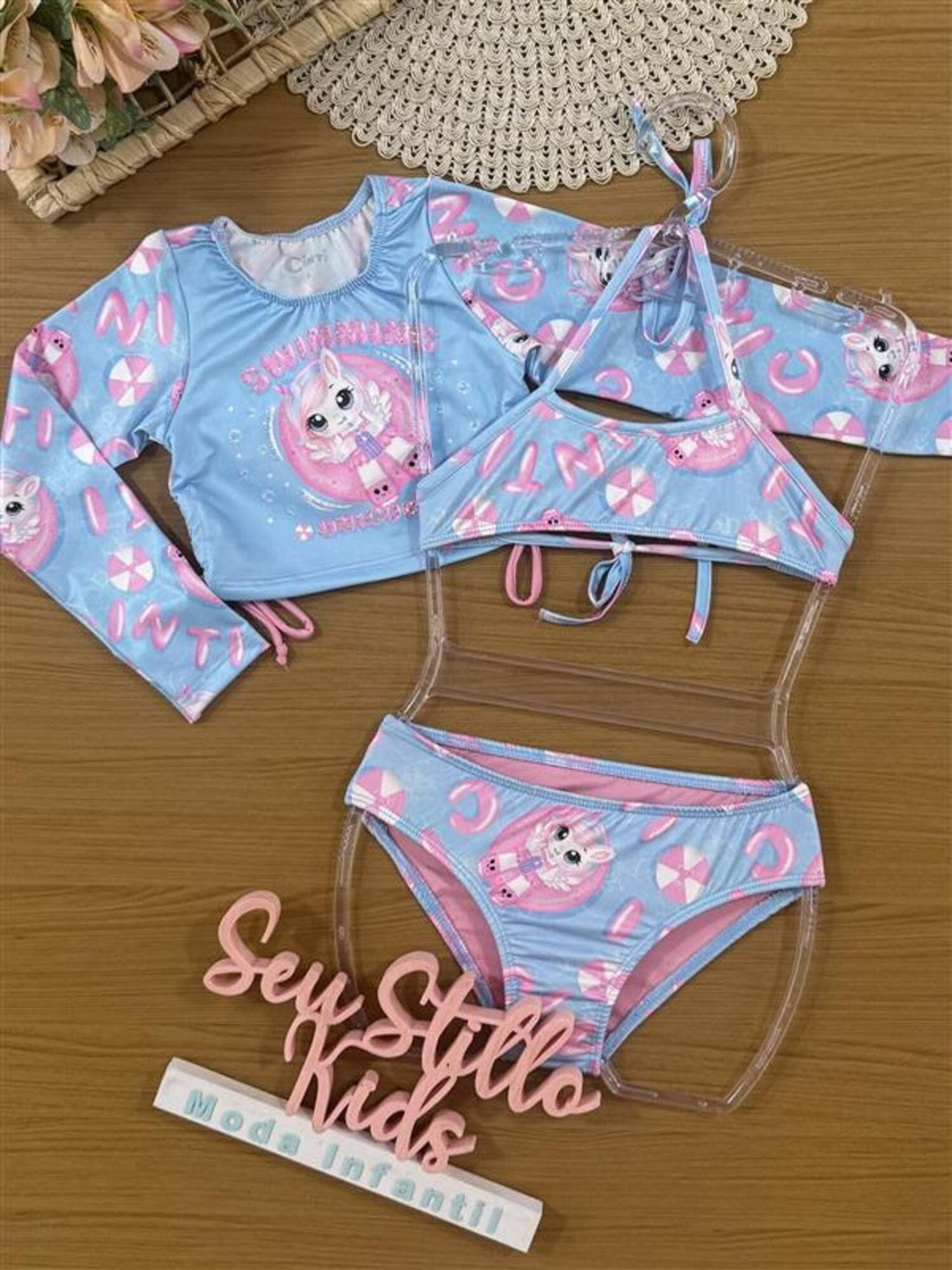 Biquíni Infantil Cinti Verão com Blusa Manga Longa Azul Unicórnio