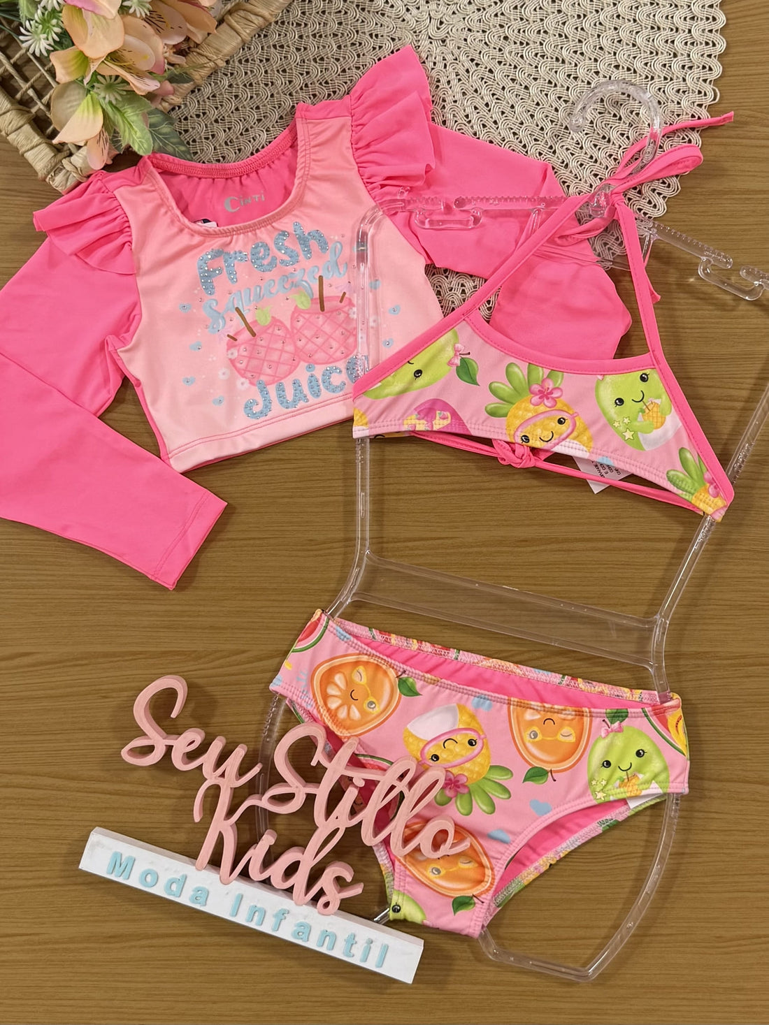 Biquíni Infantil Cinti Verão com Cropped Manga Longa Rosa Neon Fresh