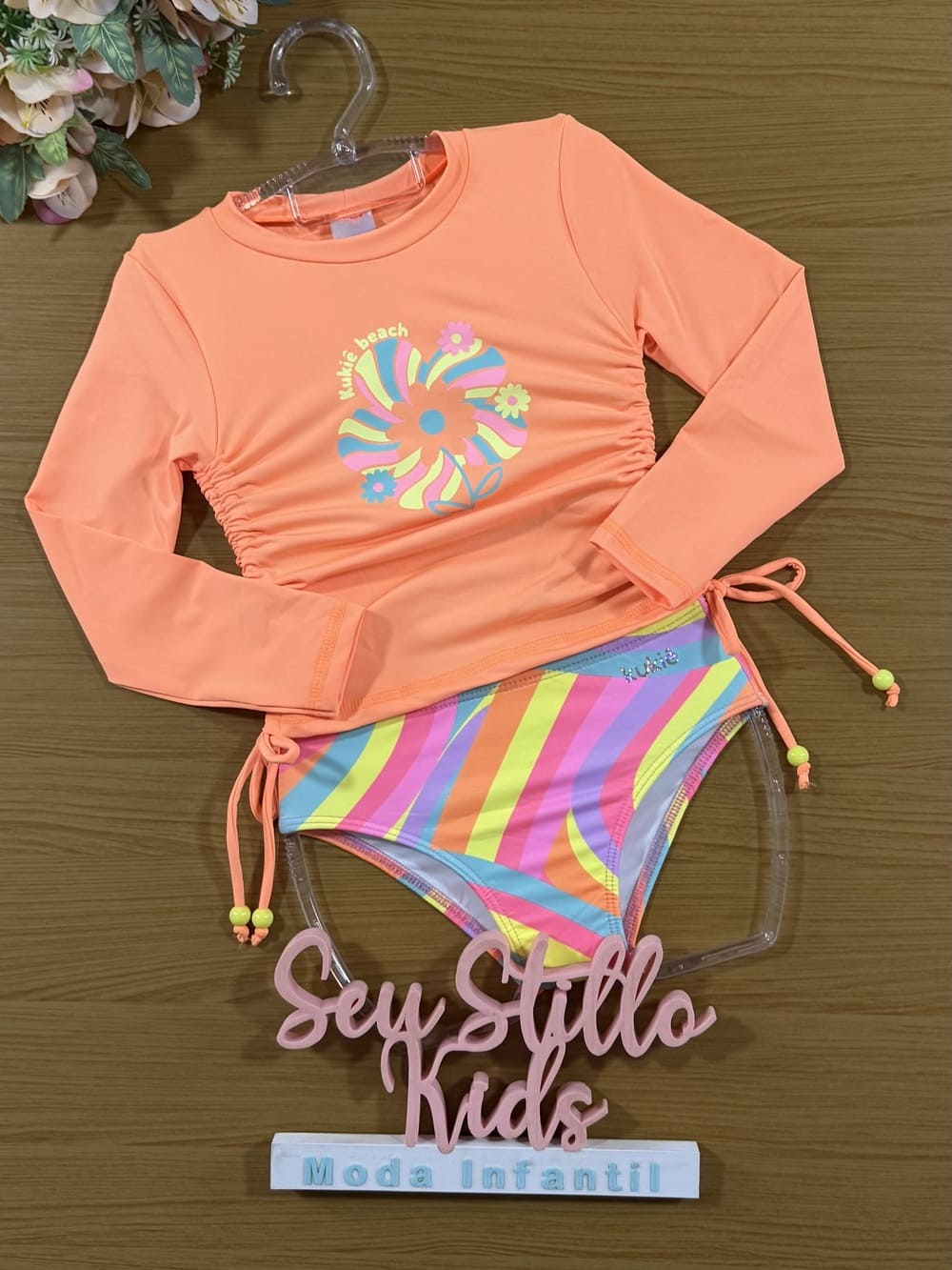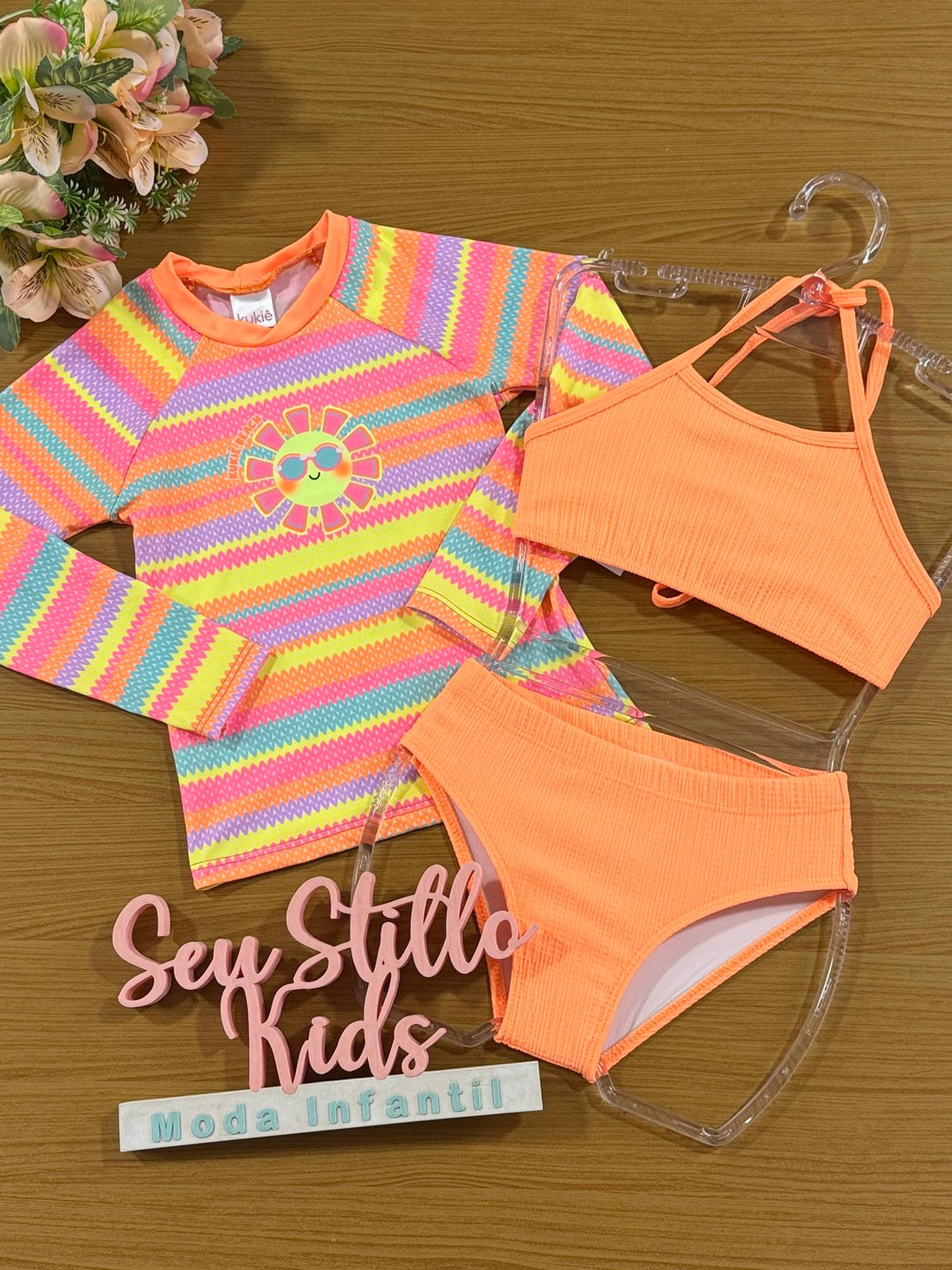Biquíni Infantil Kukie Verão Com Blusa Manga Longa e Top Laranja