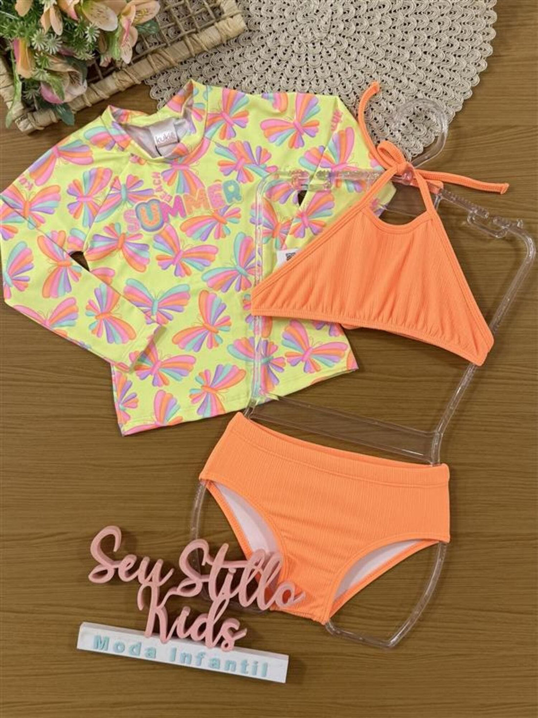 Biquíni Infantil Kukiê Verão Laranja com Blusa Manga Longa Borboleta Summer