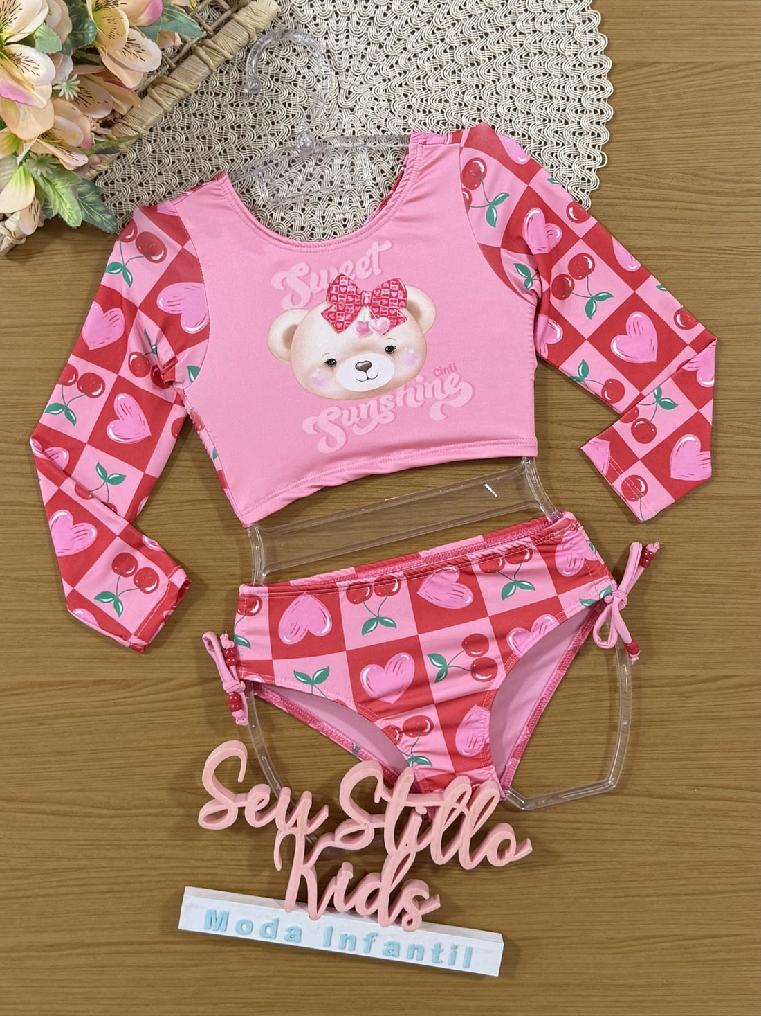 Biquíni Infantil Cinti Verão Manga Longa Rosa Ursinha