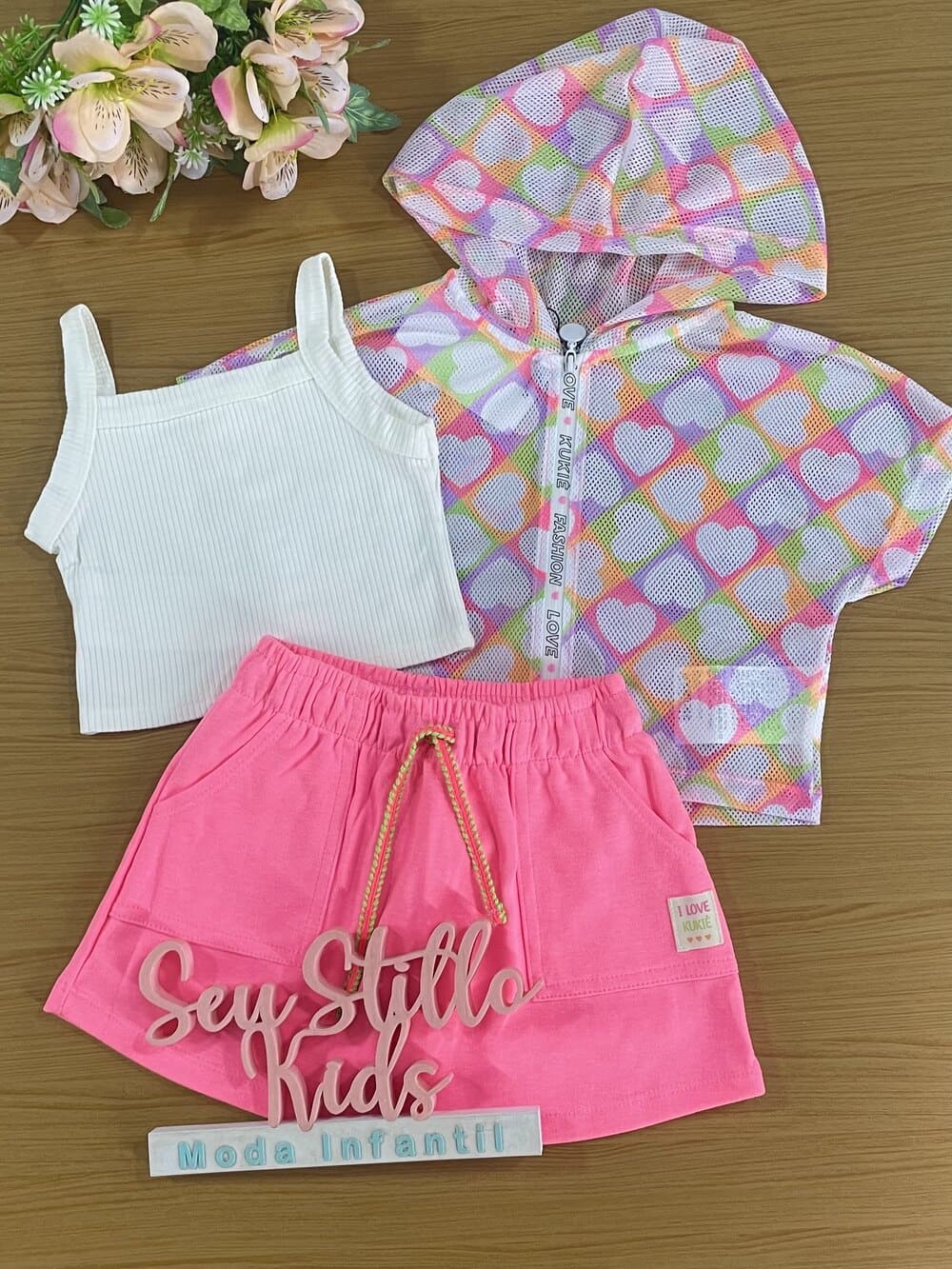 Conjunto Infantil Kukie Verão Saia e Blusa com Colete Corações Coloridos