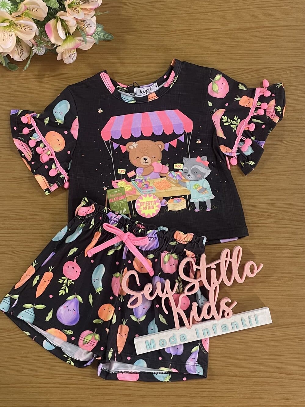 Conjunto Infantil Kukie Alecrim Verão Shorts e Blusa Preta Ursinha