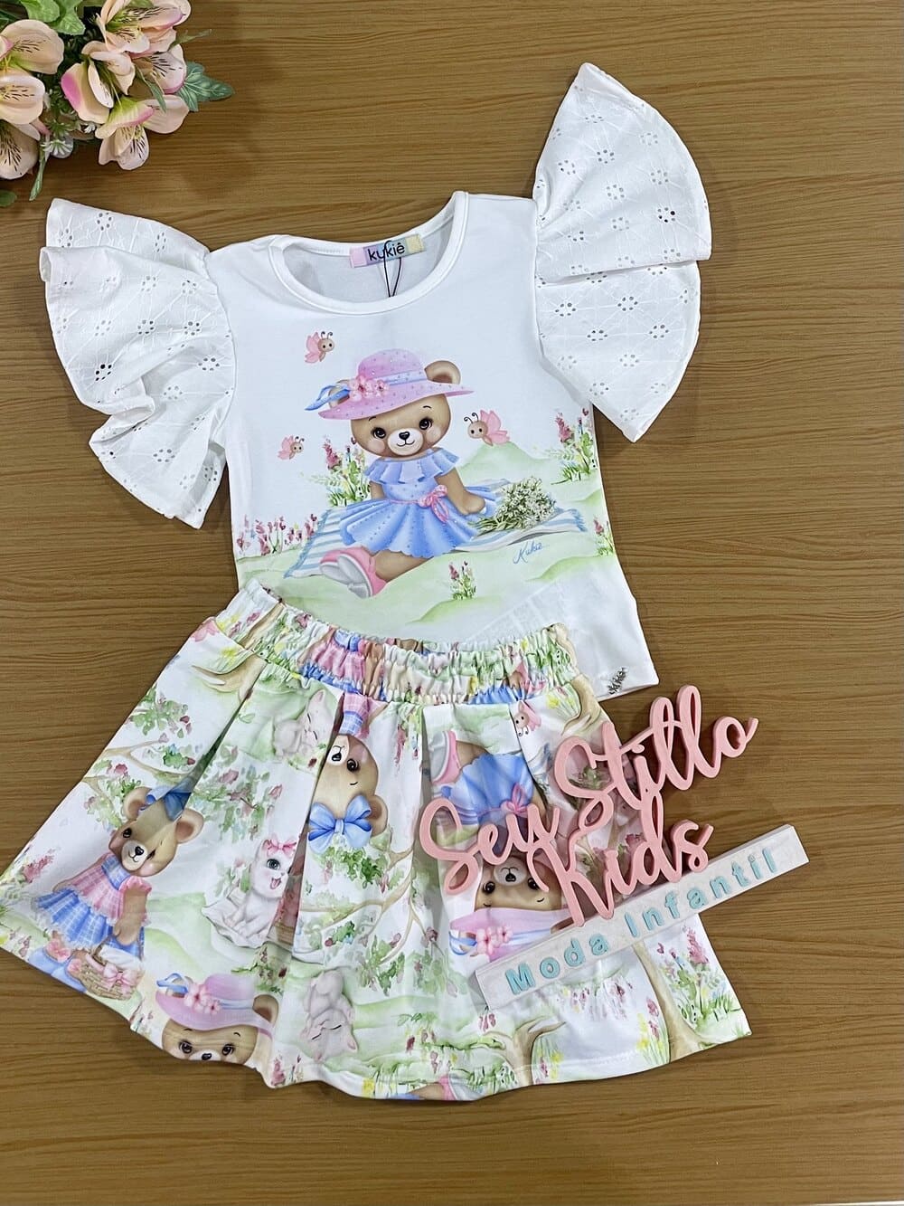Conjunto Infantil Kukie Verão Com Saia e Blusa Ursinha Piquenique