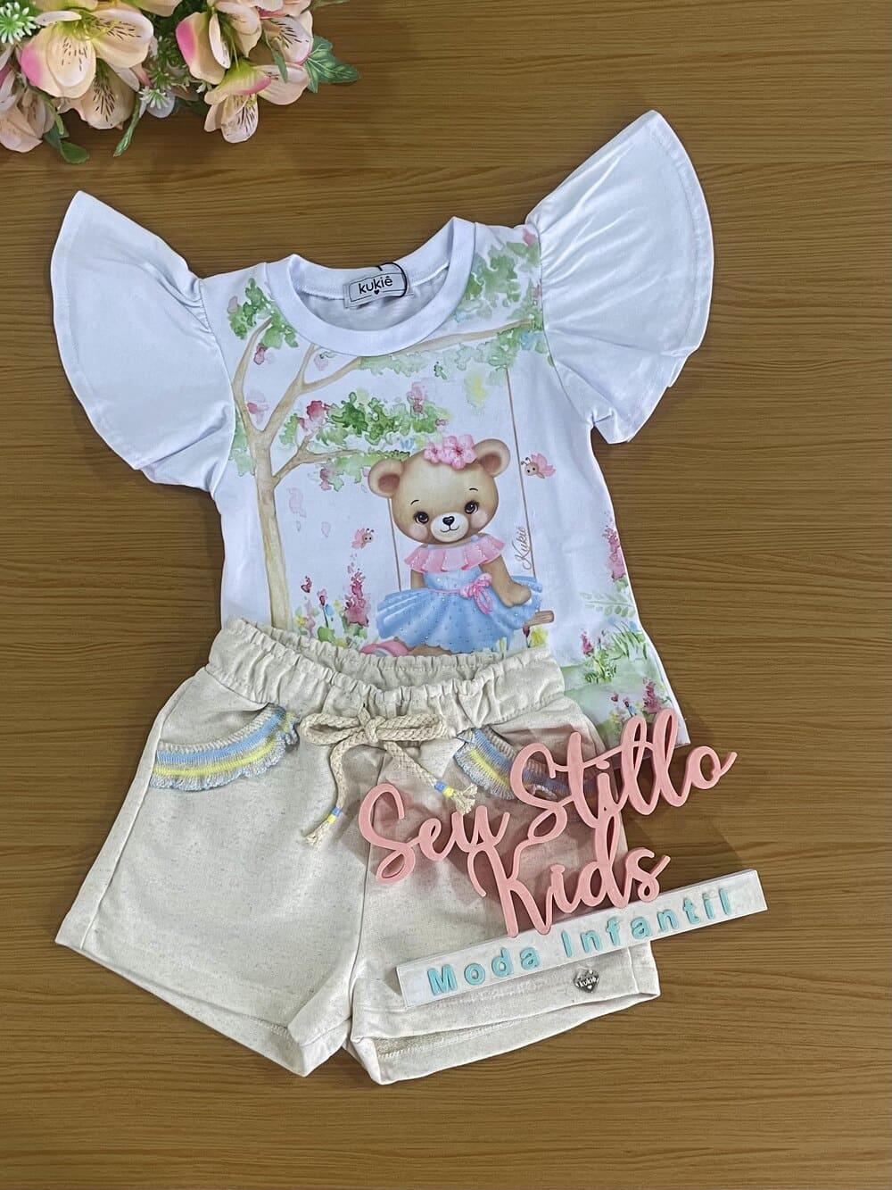 Conjunto Infantil Kukie Alecrim Verão Shorts e Blusa Bege Ursinha