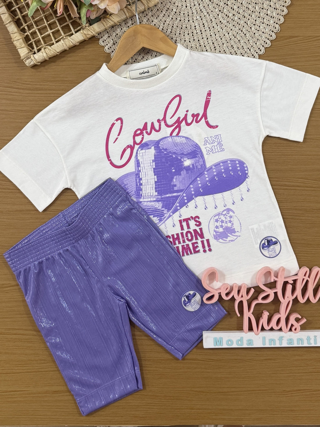 Conjunto Infantil Animê Verão com Shorts Ciclista Lilás e Blusa Branca Cowgirl