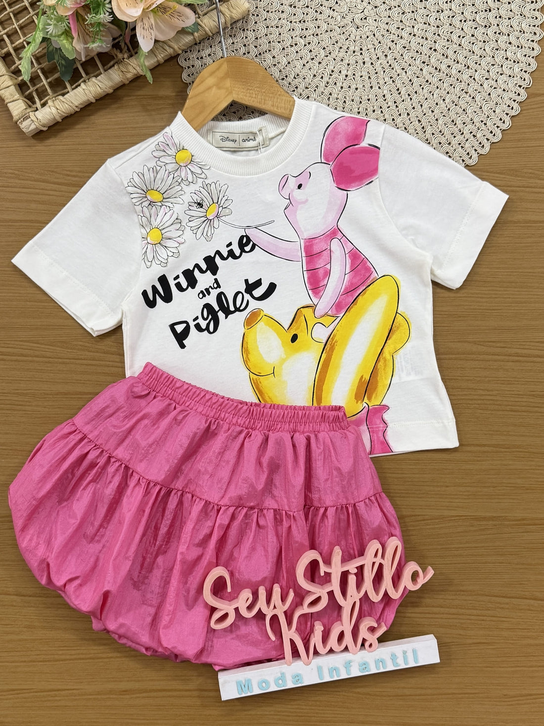 Conjunto Infantil Animê Verão Saia Balone Rosa e Blusa Branca Pooh e Leitão Disney