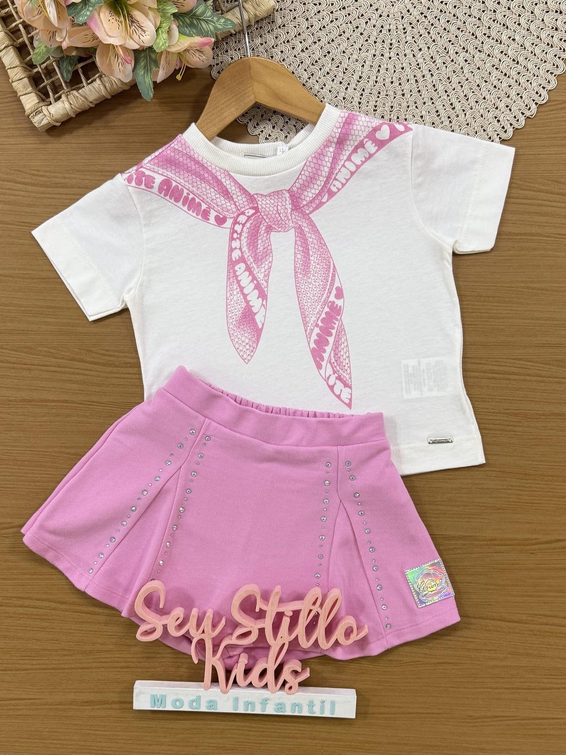 Conjunto Infantil Animê Verão com Shorts Saia Rosa e Blusa Branca com Laço