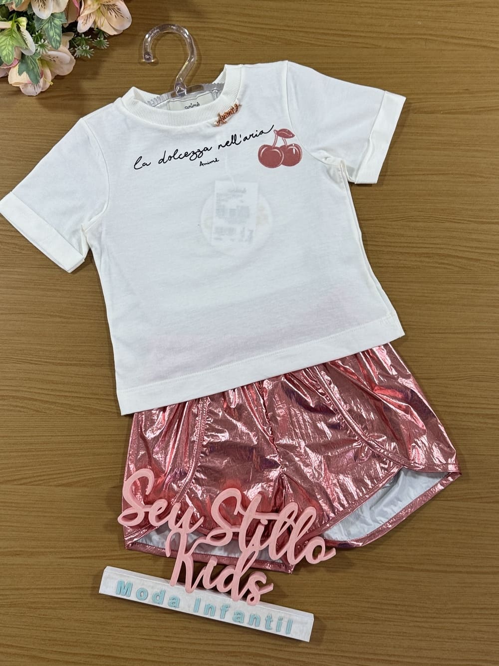 Conjunto Infantil Animê Verão Shorts Metalizado Rosê e Blusa Cereja