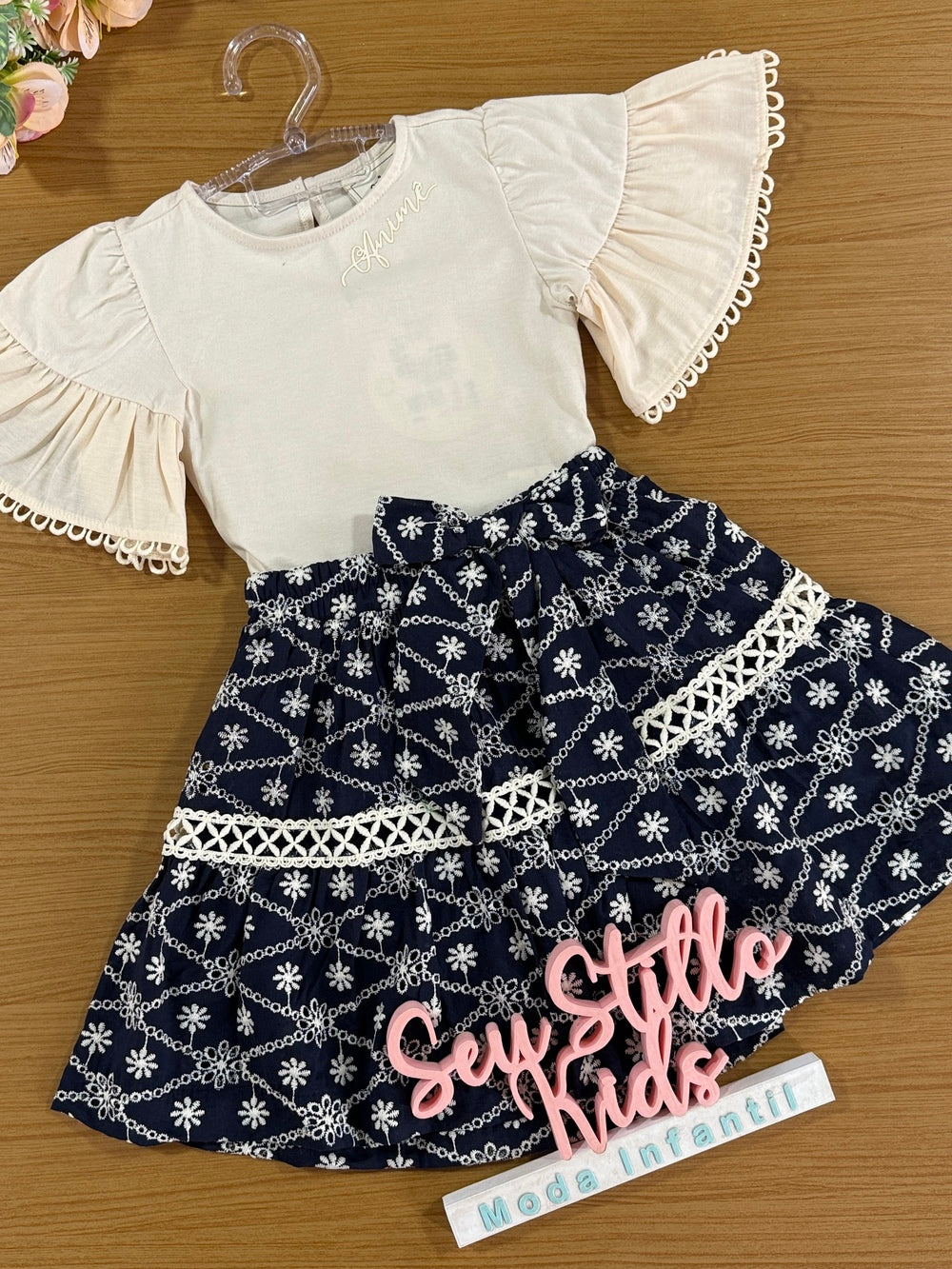 Conjunto Infantil Animê Verão Saia Bordada e Blusa