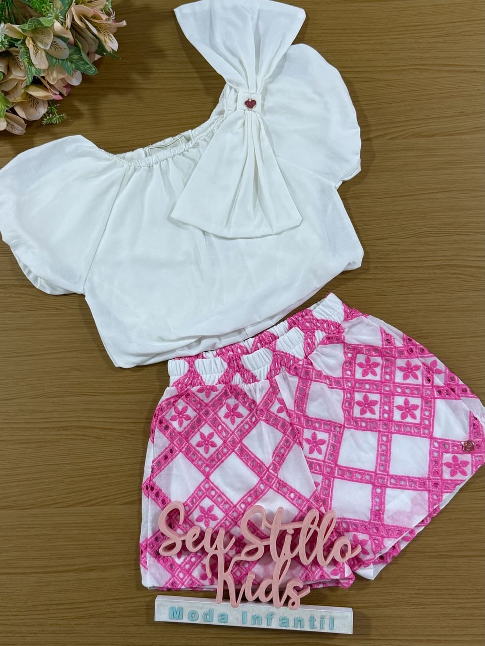 Conjunto Infantil Animê Verão Shorts com Detalhes Rosa e Blusa Branca Balonê