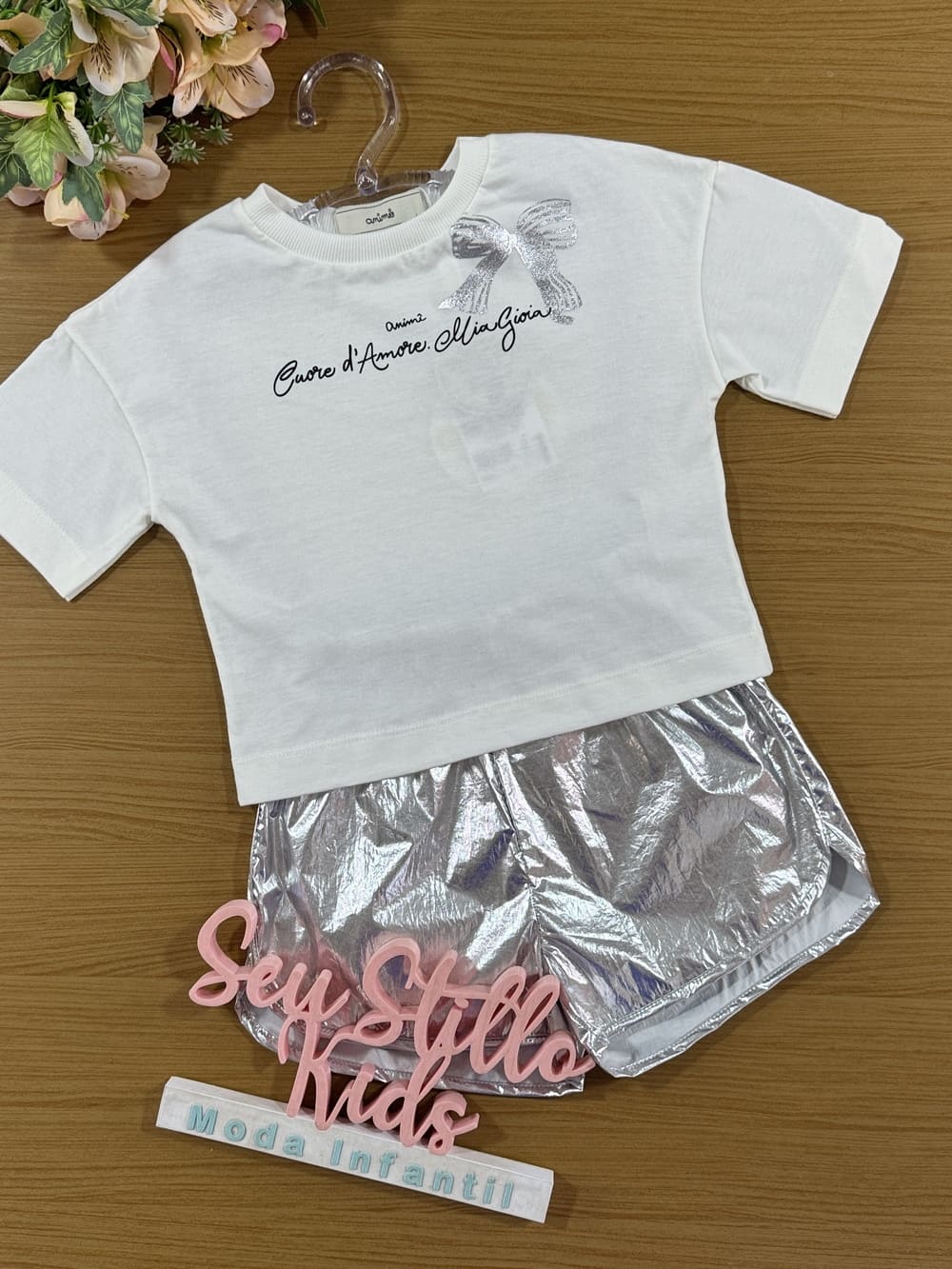 Conjunto Infantil Animê Verão Shorts Metalizado Prata e Blusa Laço