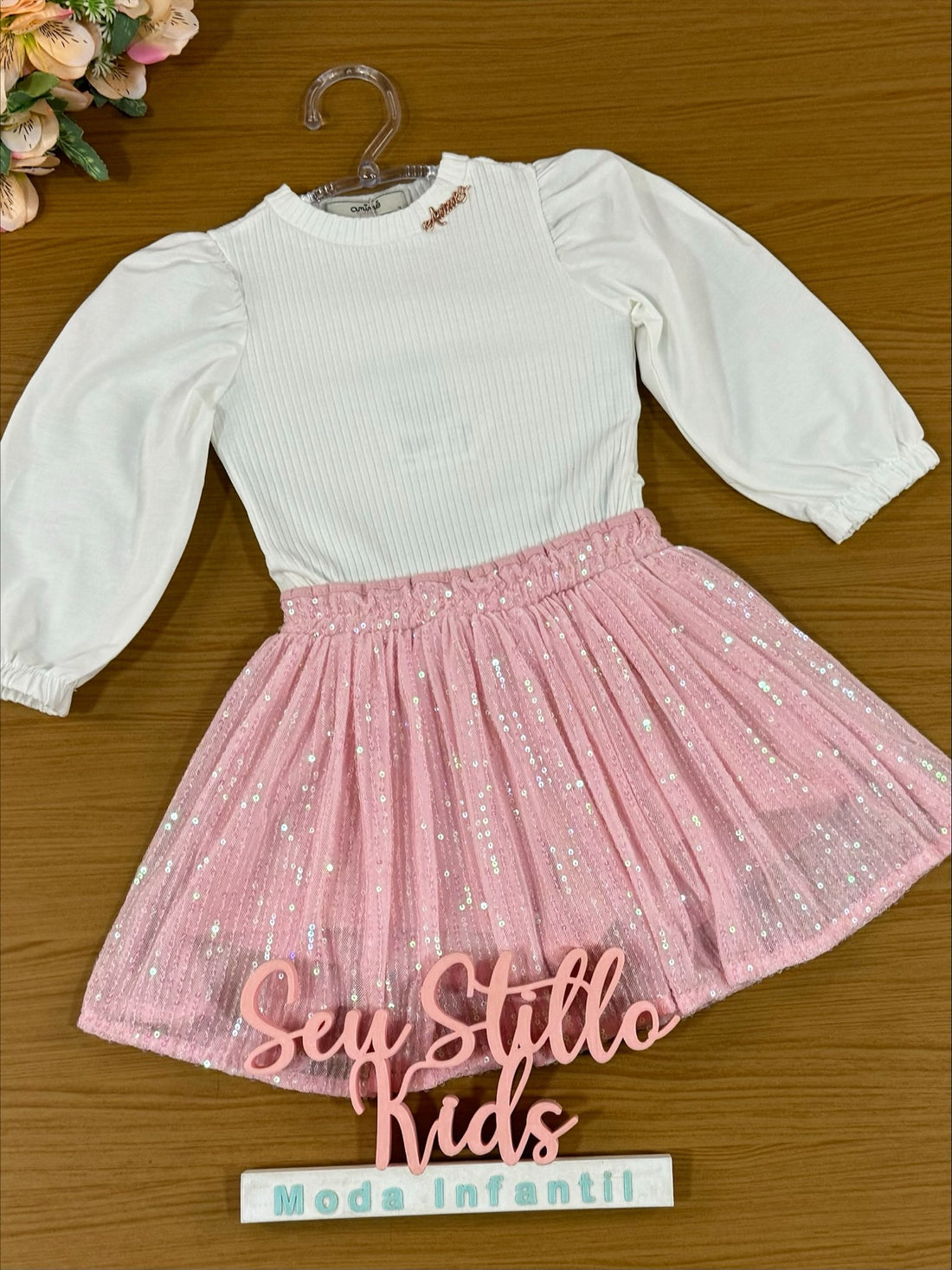 Conjunto Infantil Animê Inverno com Saia Rosa Paetê e Blusa
