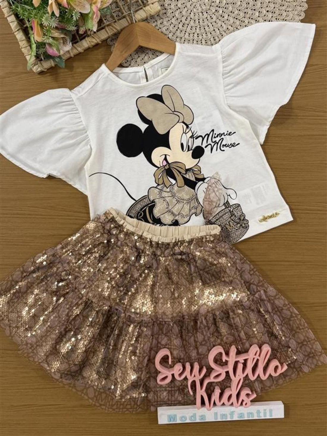 Conjunto Infantil Animê Verão com Saia Dourada em Tule e Blusa Branca Minnie com Laçinho Disney