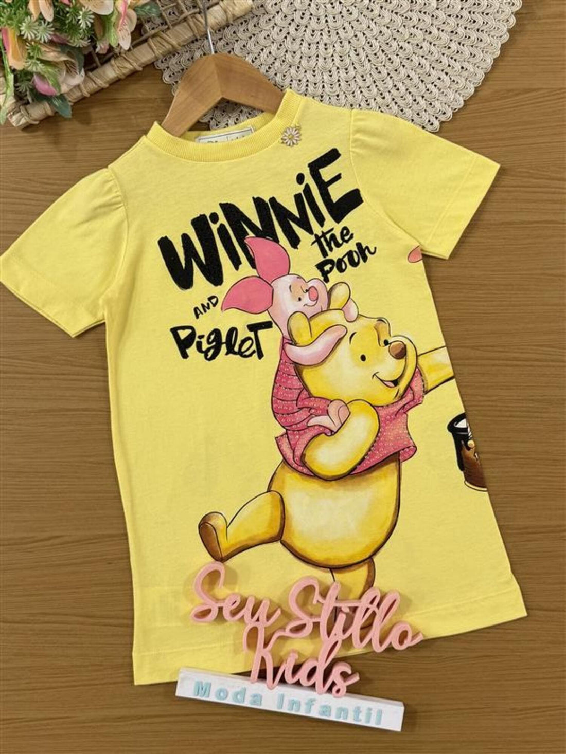 Vestido Infantil Animê Verão Amarelo Pooh e Leitão Disney