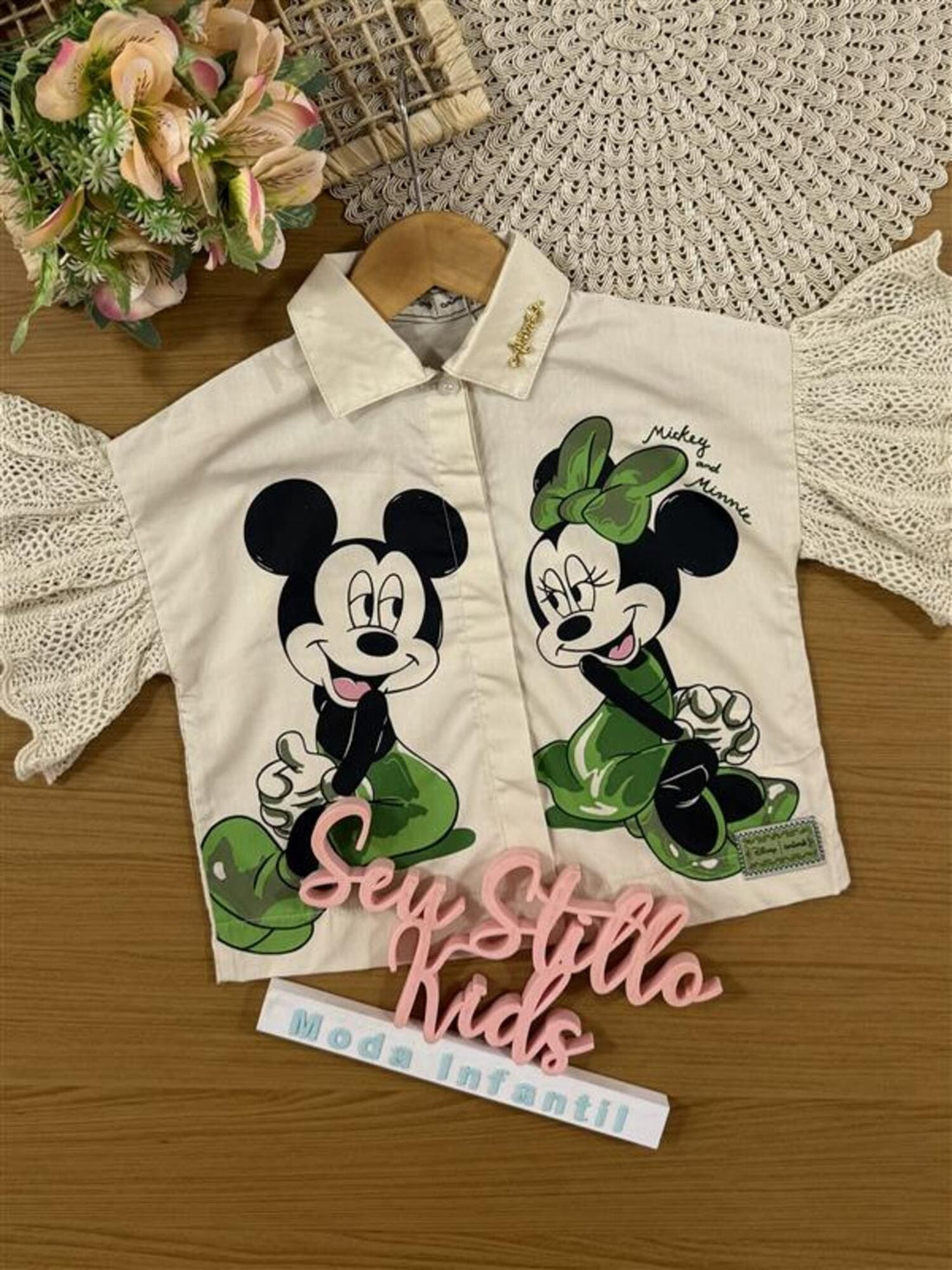 Camisa Infantil Animê Verão Bege com Tricot Minnie e Mickey Disney