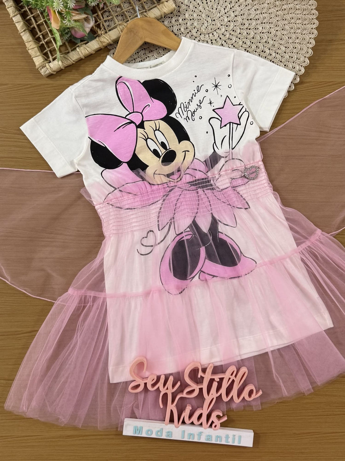 Vestido Infantil Animê Verão Branco com Sobreposição Rosa Minnie Disney