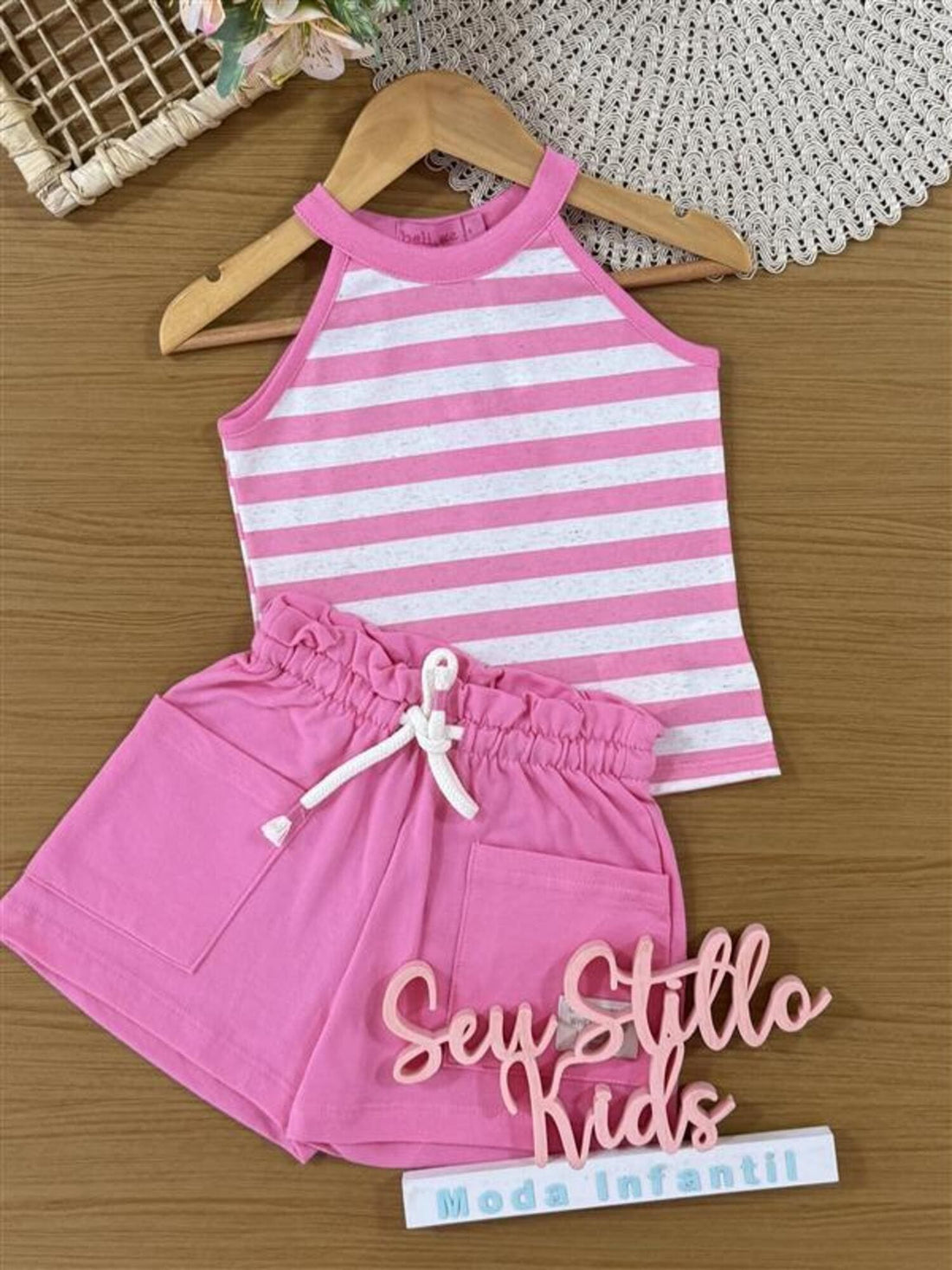 Conjunto Infantil Belime Verão com Shorts Rosa e Regata Listrada
