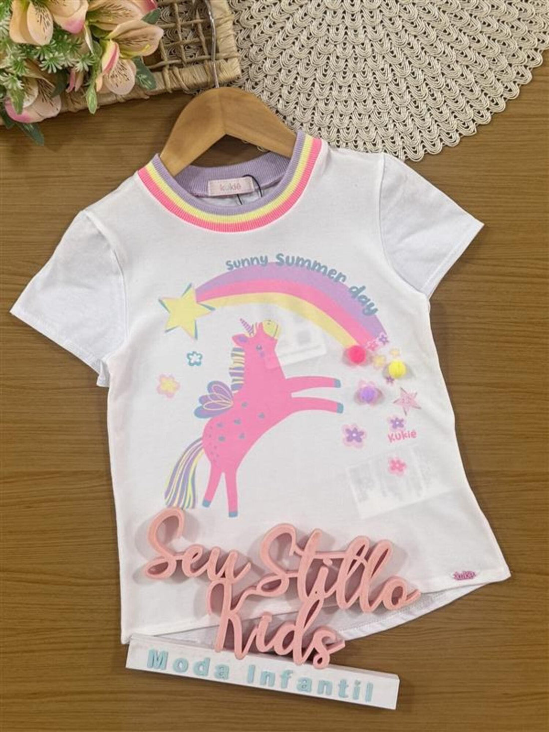 Blusa Infantil Kukiê Verão Branca Unicórnio Arco-íris