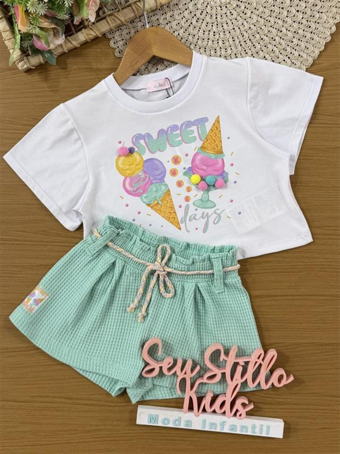 Conjunto Infantil Kukiê Verão com Shorts Verde e Blusa Branca Sorvetinho
