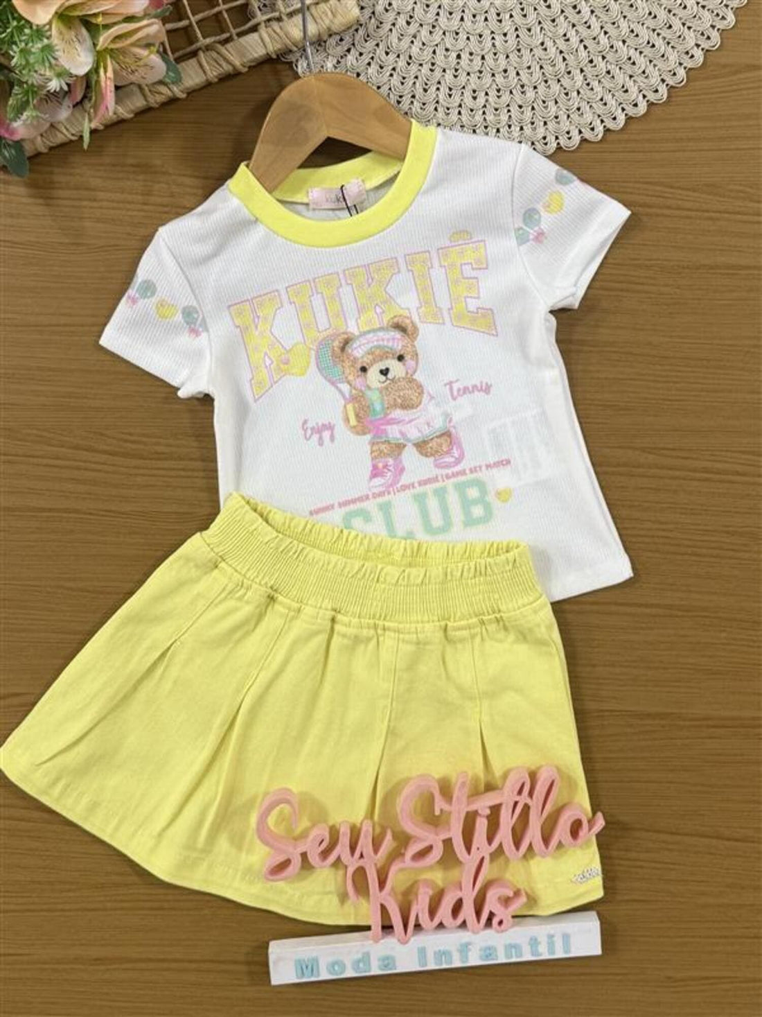 Conjunto Infantil Kukiê Verão com Shorts Saia Amarelo e Blusa Branca Ursinha Tênista