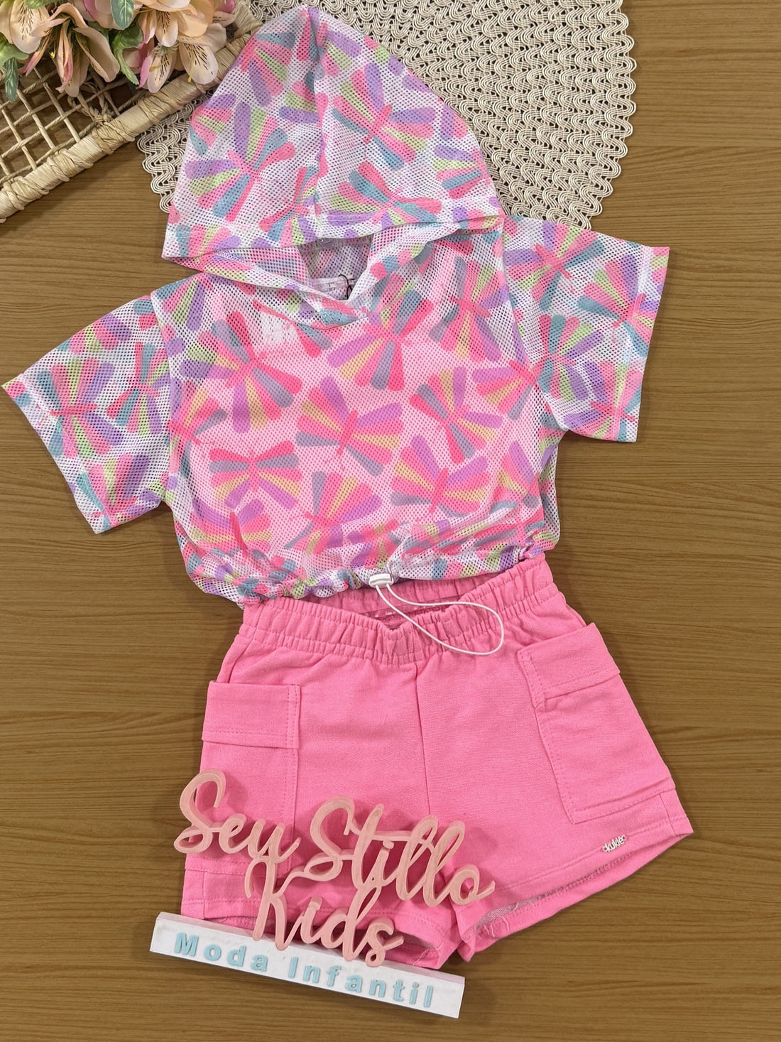 Conjunto Infantil Kukiê Verão com Shorts Rosa e Blusa Branca Florzinha Arco-irís
