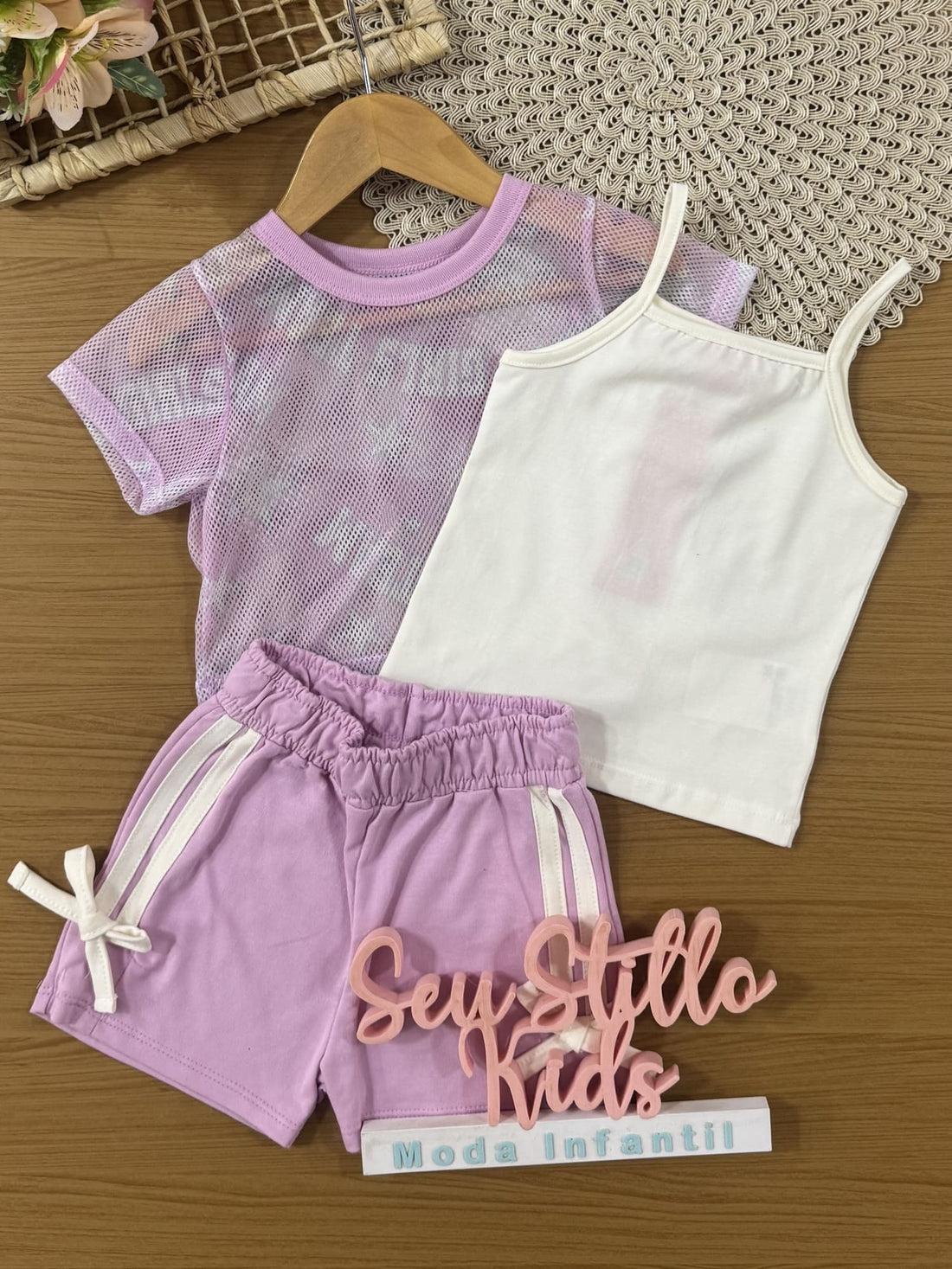 Conjunto Infantil Cinti Verão, Shorts e Sobreposição em Tela Lilás e Regata Branca