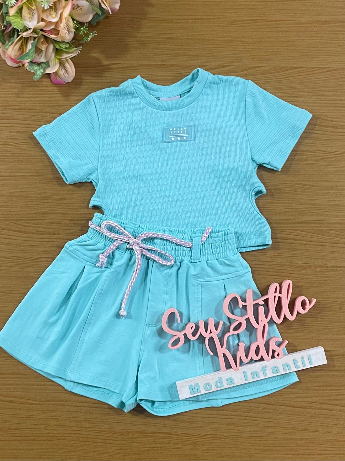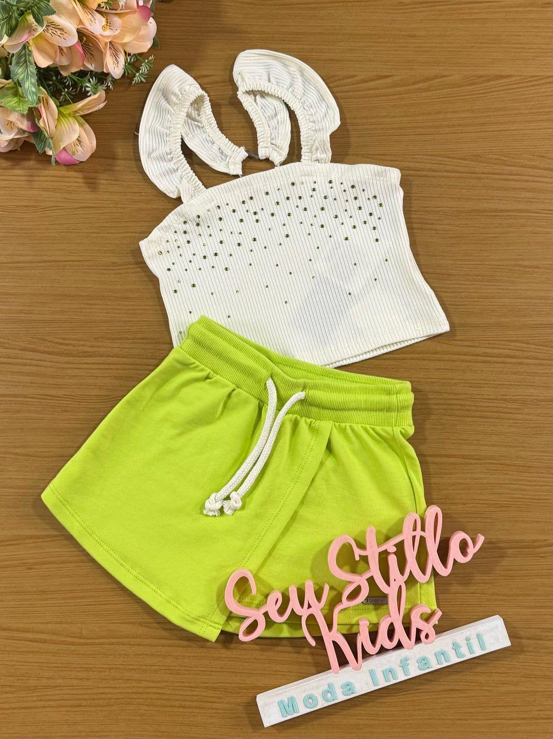 Conjunto Infantil Catavento Verão Shorts Saia Verde e Blusa Brilho