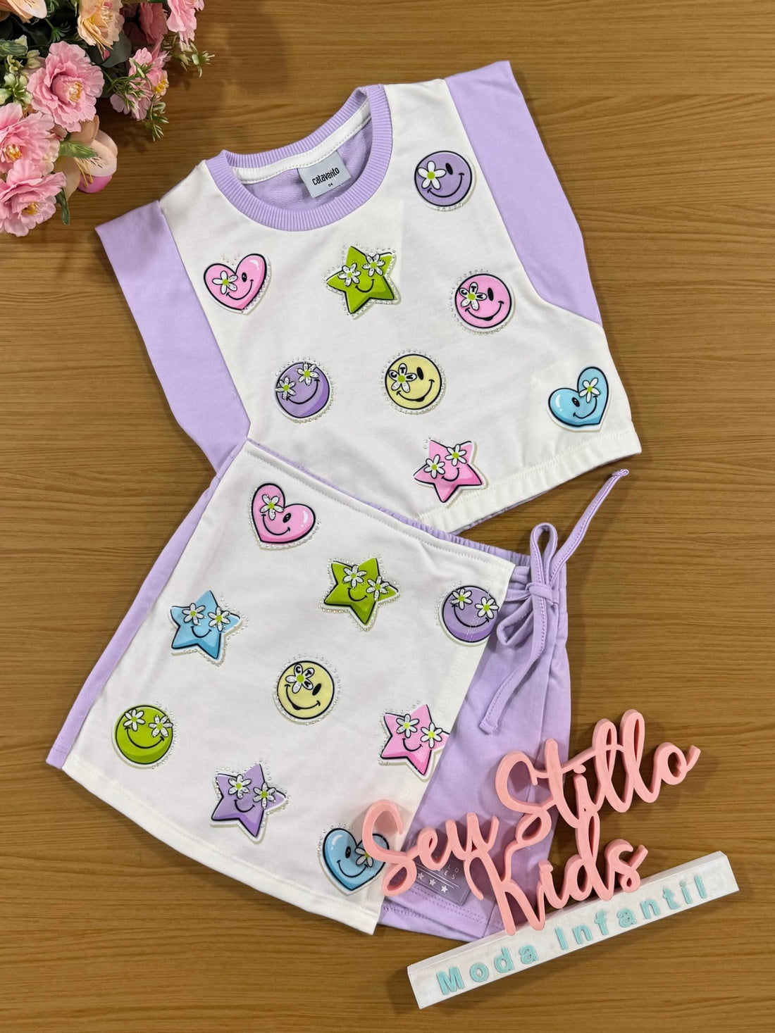 Conjunto Infantil Catavento Verão Shorts Saia e Blusa Lilás Emoji