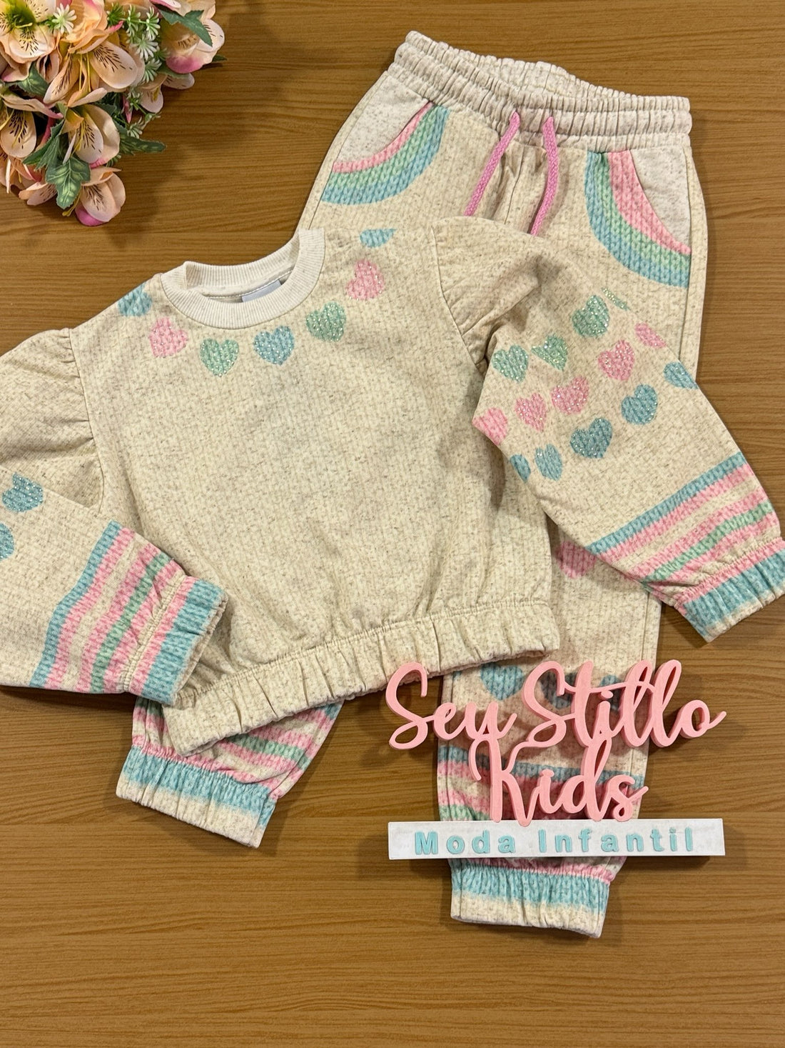 Conjunto Infantil Catavento Inverno Calça e Moletom Flanelado Corações Bege