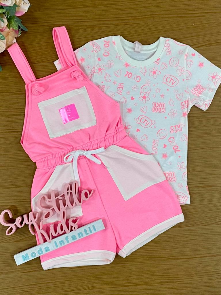 Jardineira Infantil Catavento Verão Com Blusa Rosa Love