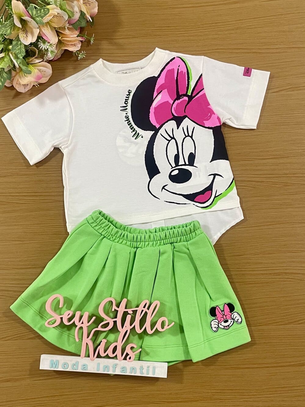 Conjunto Infantil Animê Verão Shorts Saia Verde e Blusa Minnie Disney