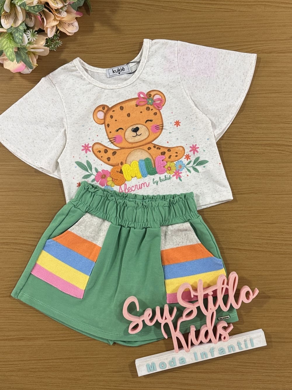 Conjunto Infantil Kukie Alecrim Verão Shorts Verde e Blusa Oncinha