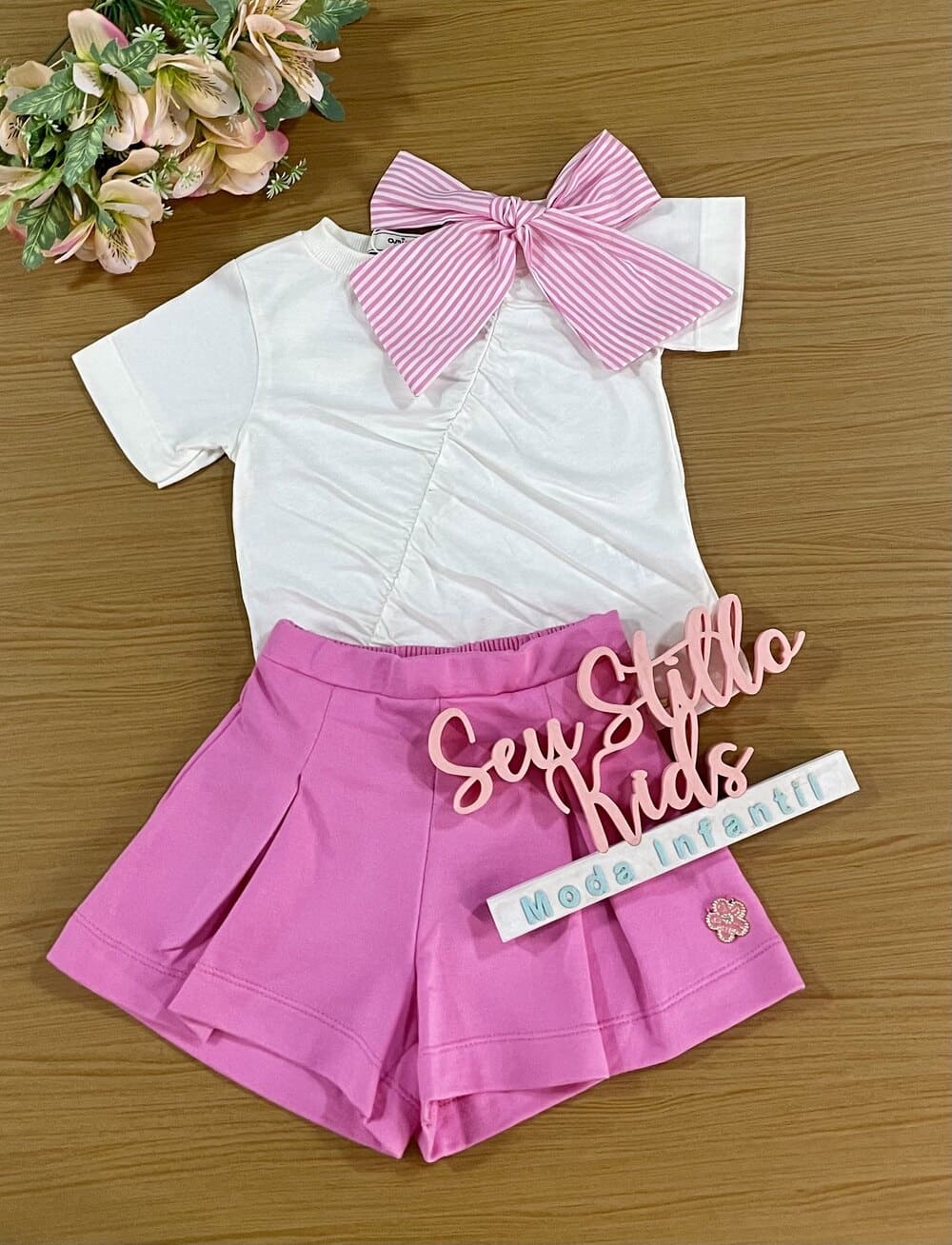 Conjunto Infantil Animê Verão Shorts Rosa e Blusa Branca Lacinho